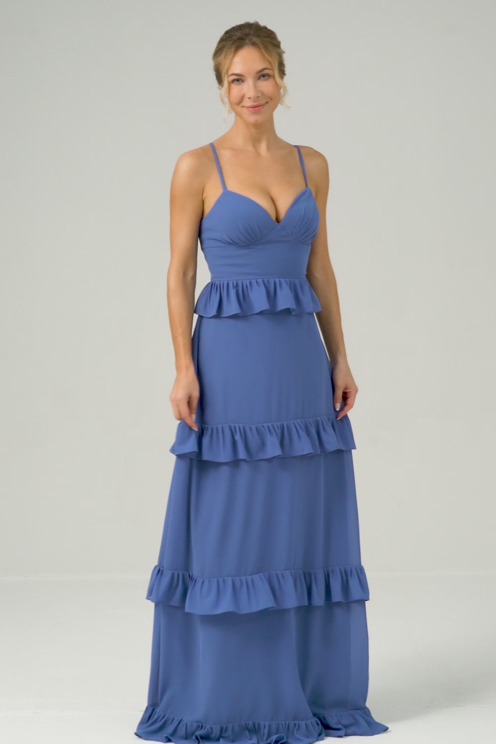 Dark Blue A-Line Spaghetti Straps Tiered Long Bridesmaid Dress with Lace Up Back
