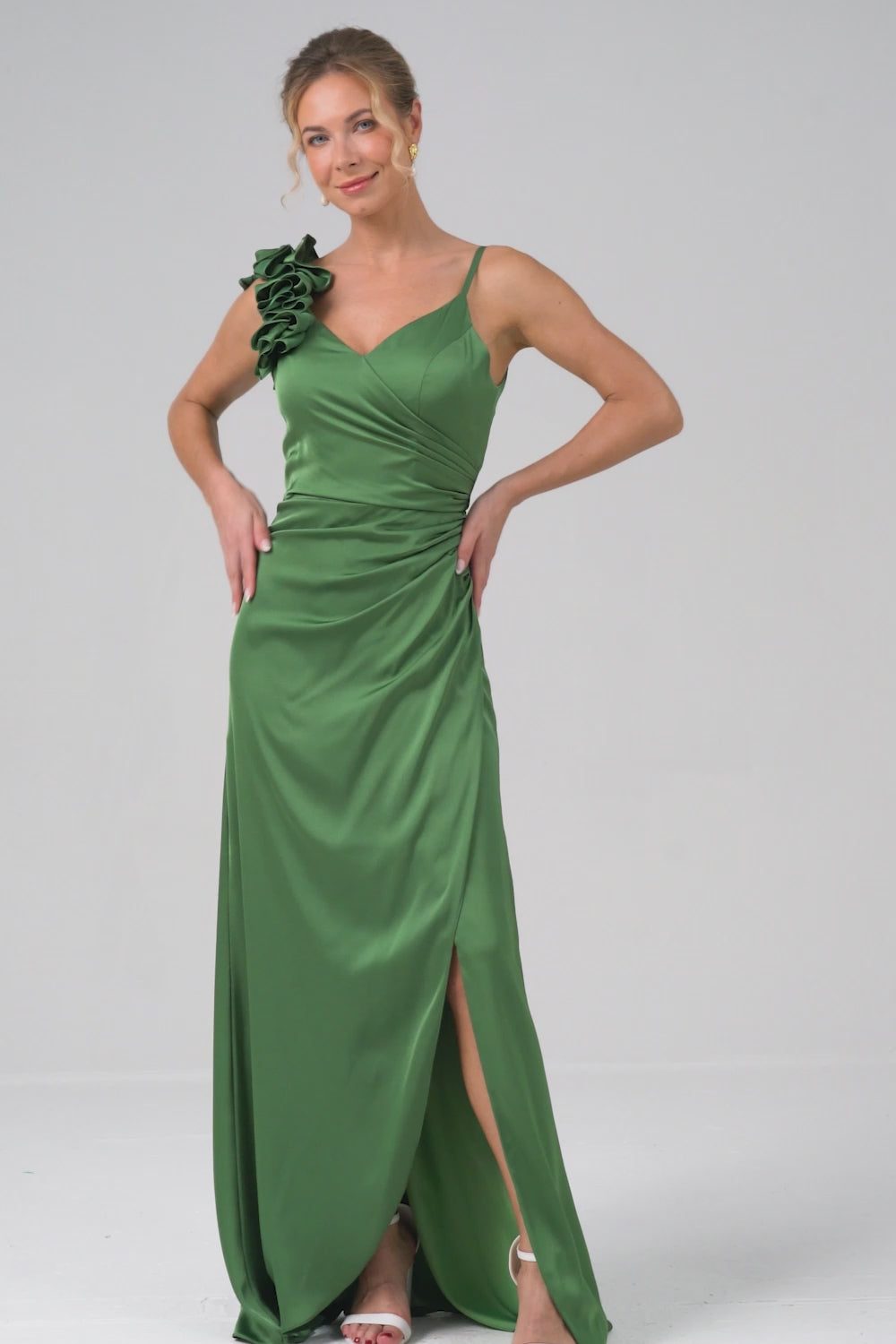Sheath Spaghetti Straps Pleated Satin Olive Green Long Bridesmaid Dress with Slit