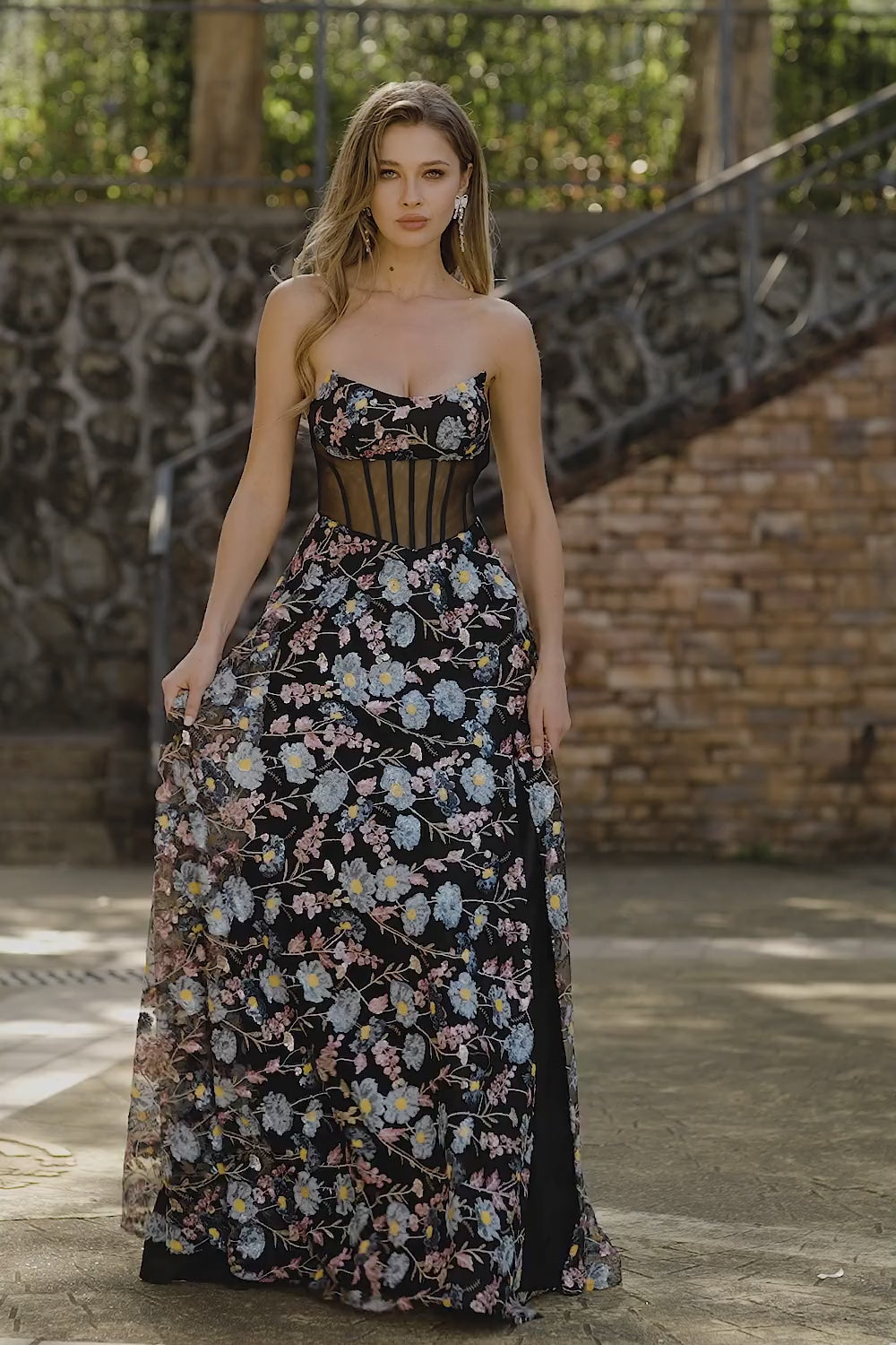 Black Flower Strapless A-Line Sheer Corset Lace Up Back Long Prom Dress with Sequins