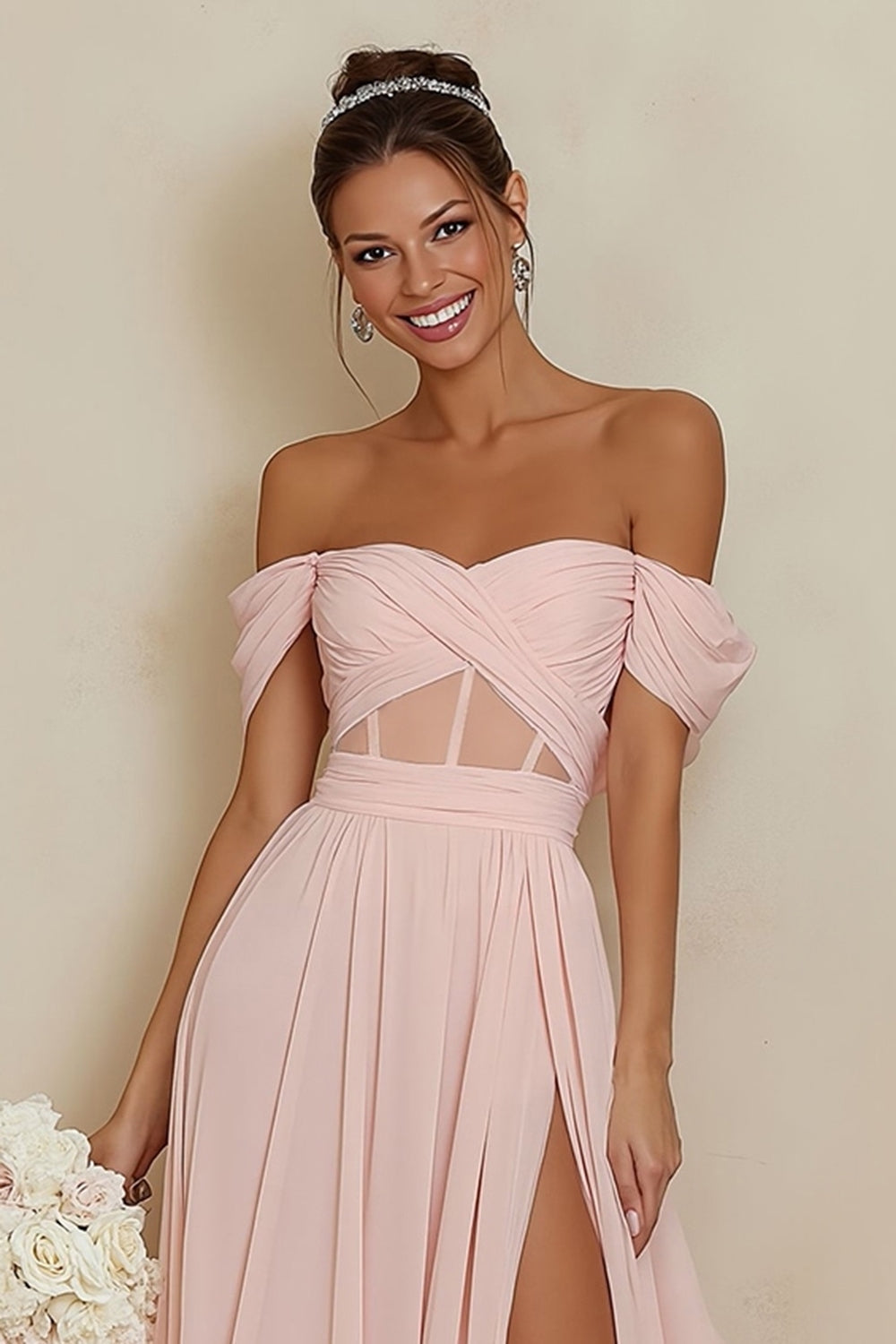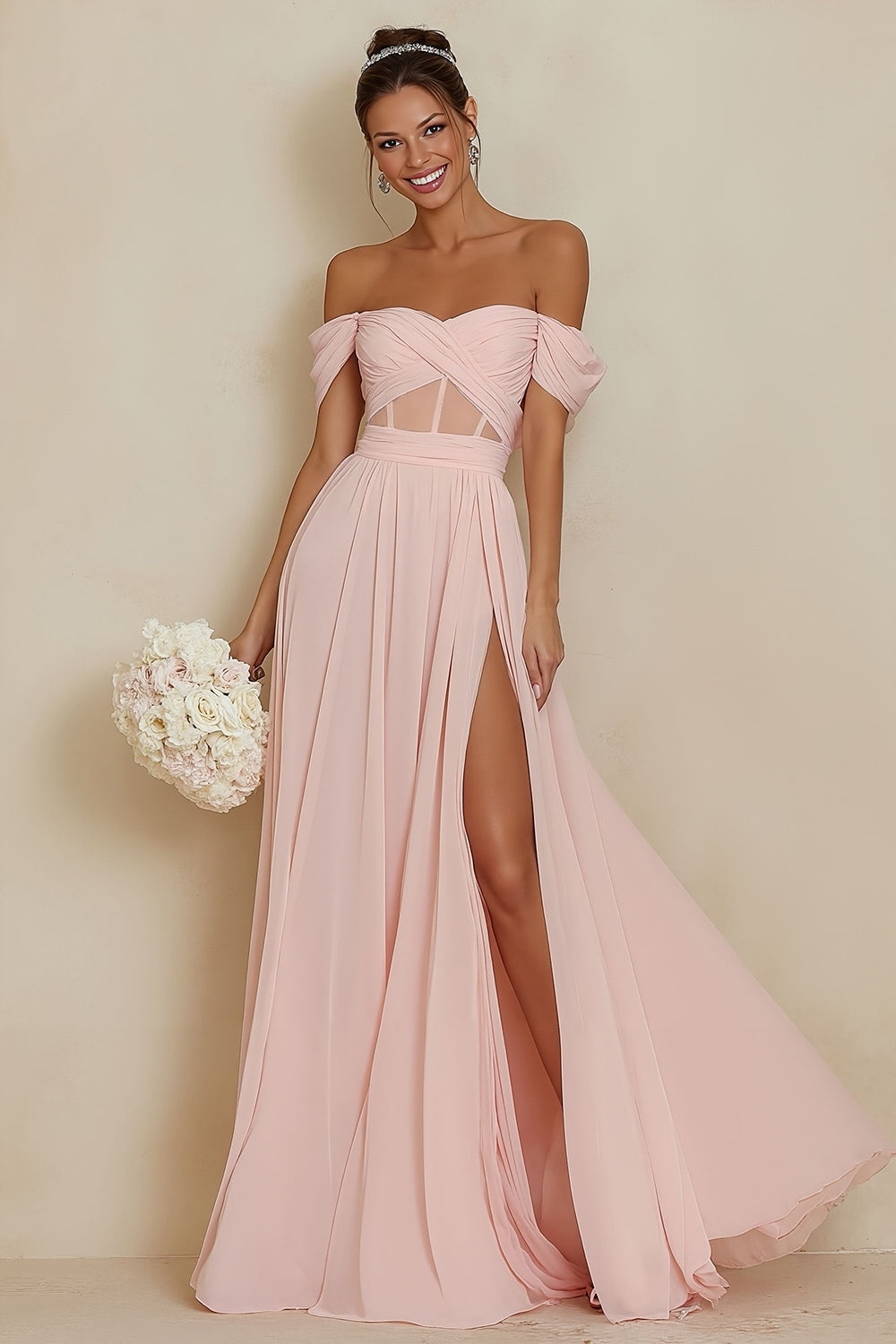 Blush Pink Corset A Line Off the Shoulder Long Bridesmaid Dress with Slit
