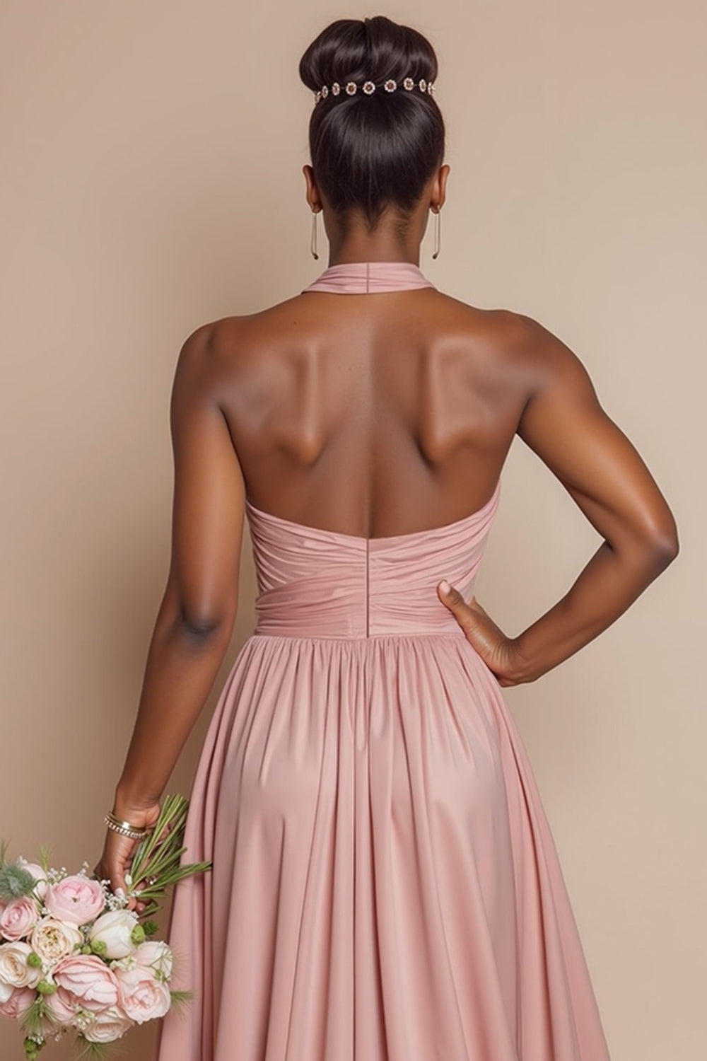 Dusty Rose Halter A Line Ruched Cut Out Long Bridesmaid Dress