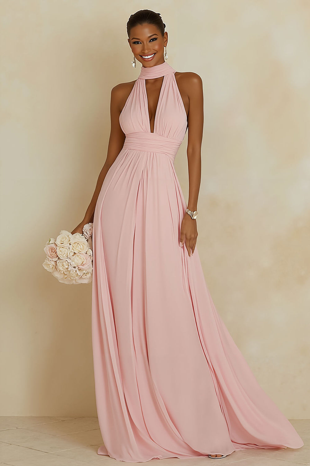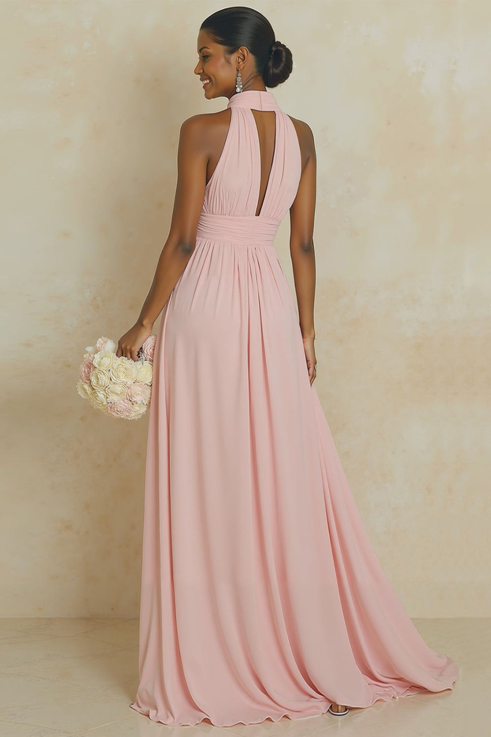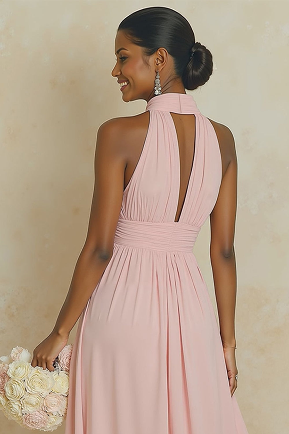 Halter Blush Pink A Line Cut Out Chiffon Long Bridesmaid Dress