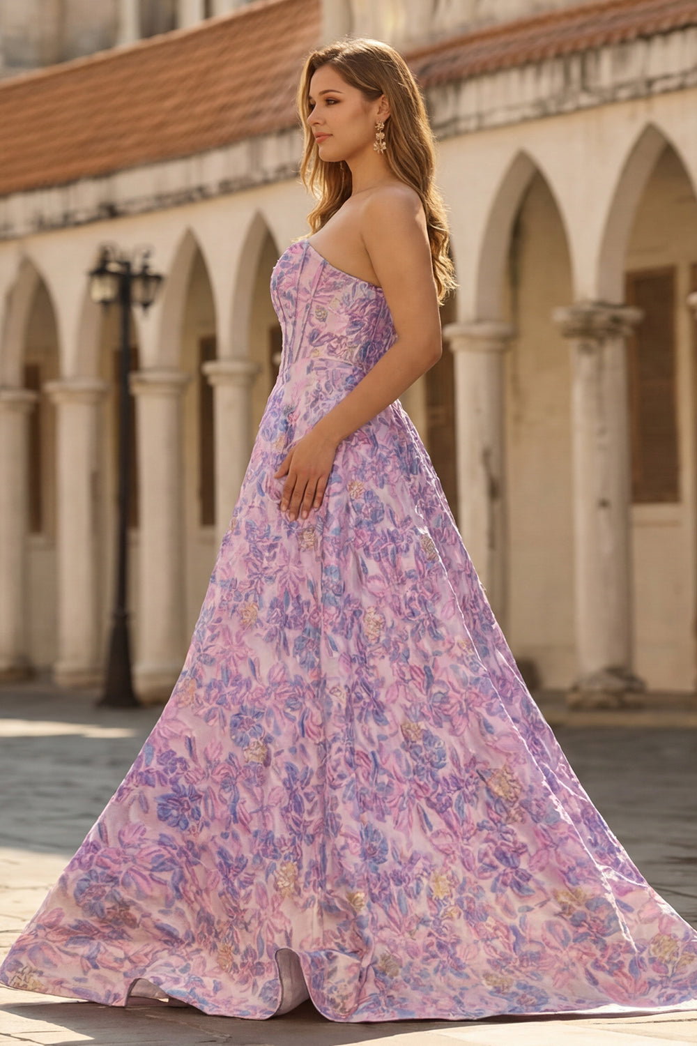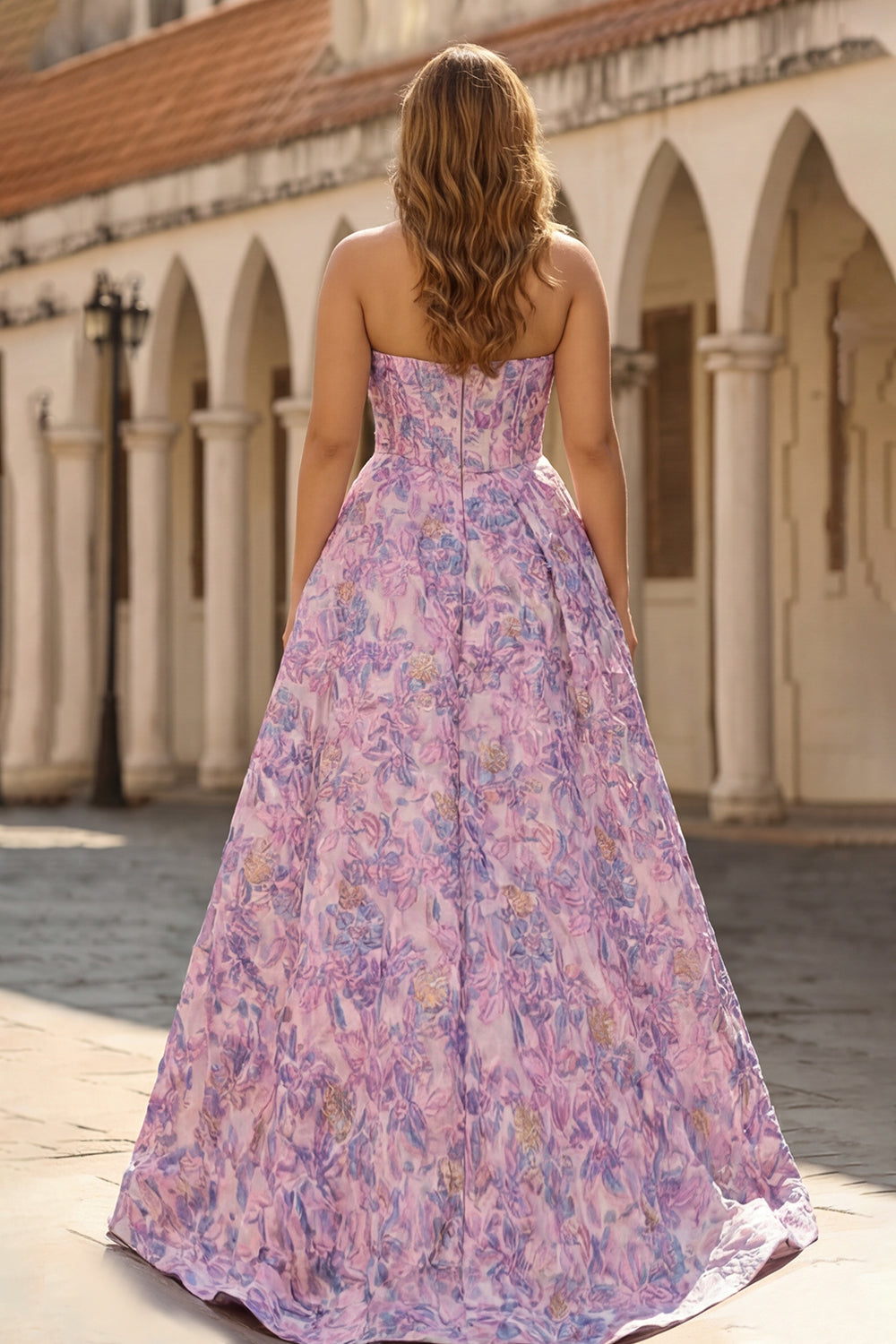 Lilac Strapless A Line Floral Jacquard Corset Plus Size Long Prom Dress