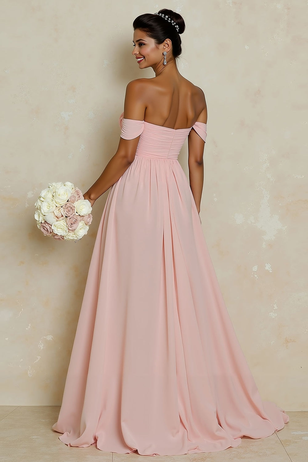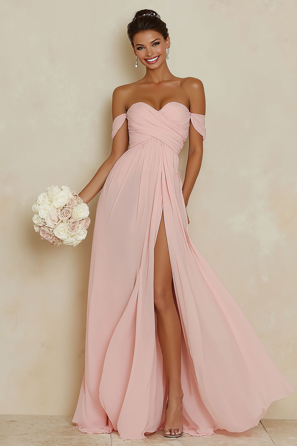 Off the Shoulder A Line Chiffon Blush Pink Bridesamid Dress with Slit