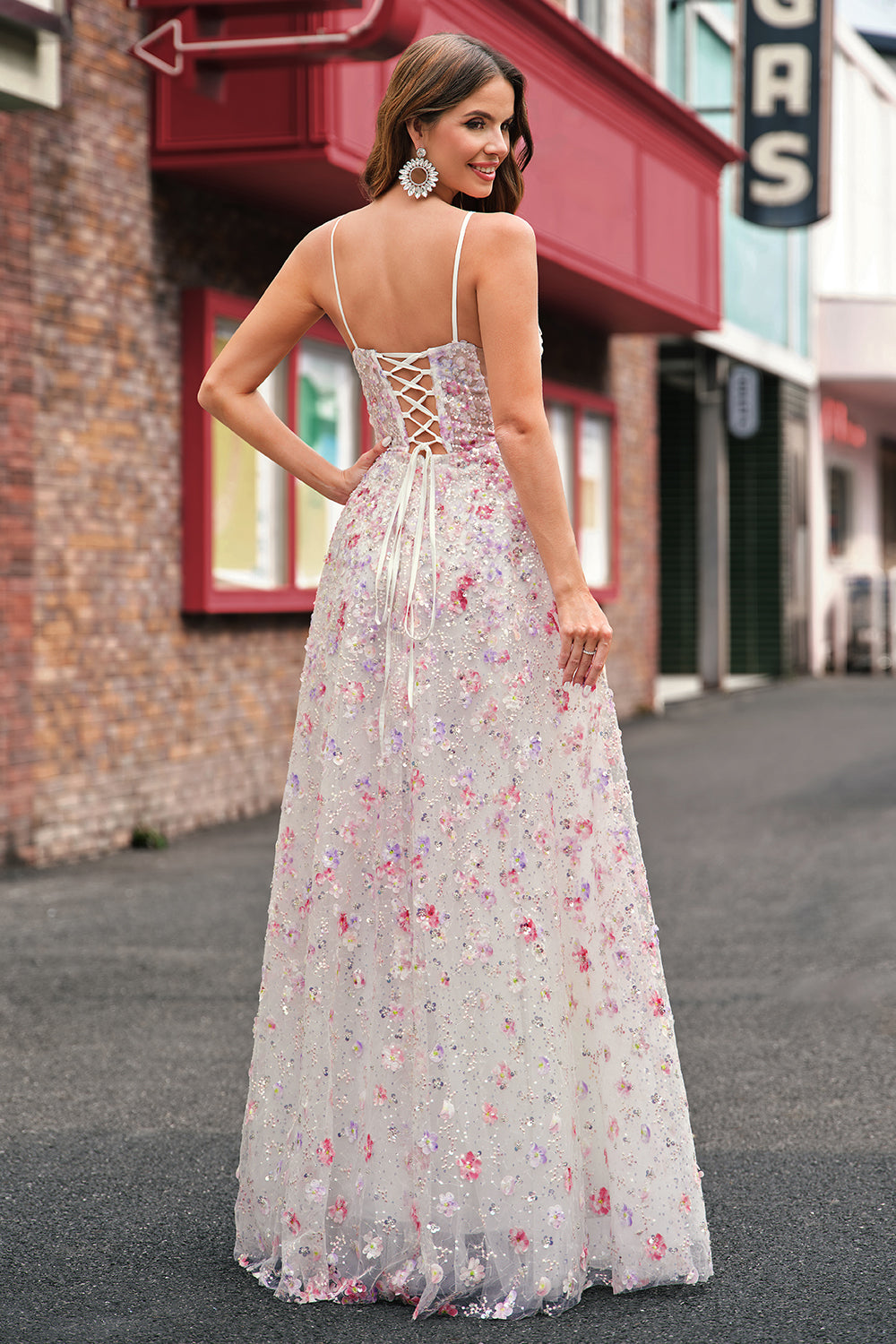 Stylish Pink A-Line Spaghetti Straps Floral Beaded Prom Dress with Lace Up Back
