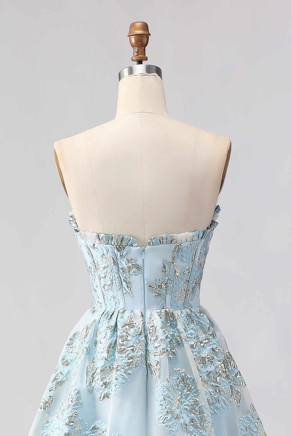 Light Blue Strapless Jacquard A Line Corset Floral Long Prom Dress with Slit
