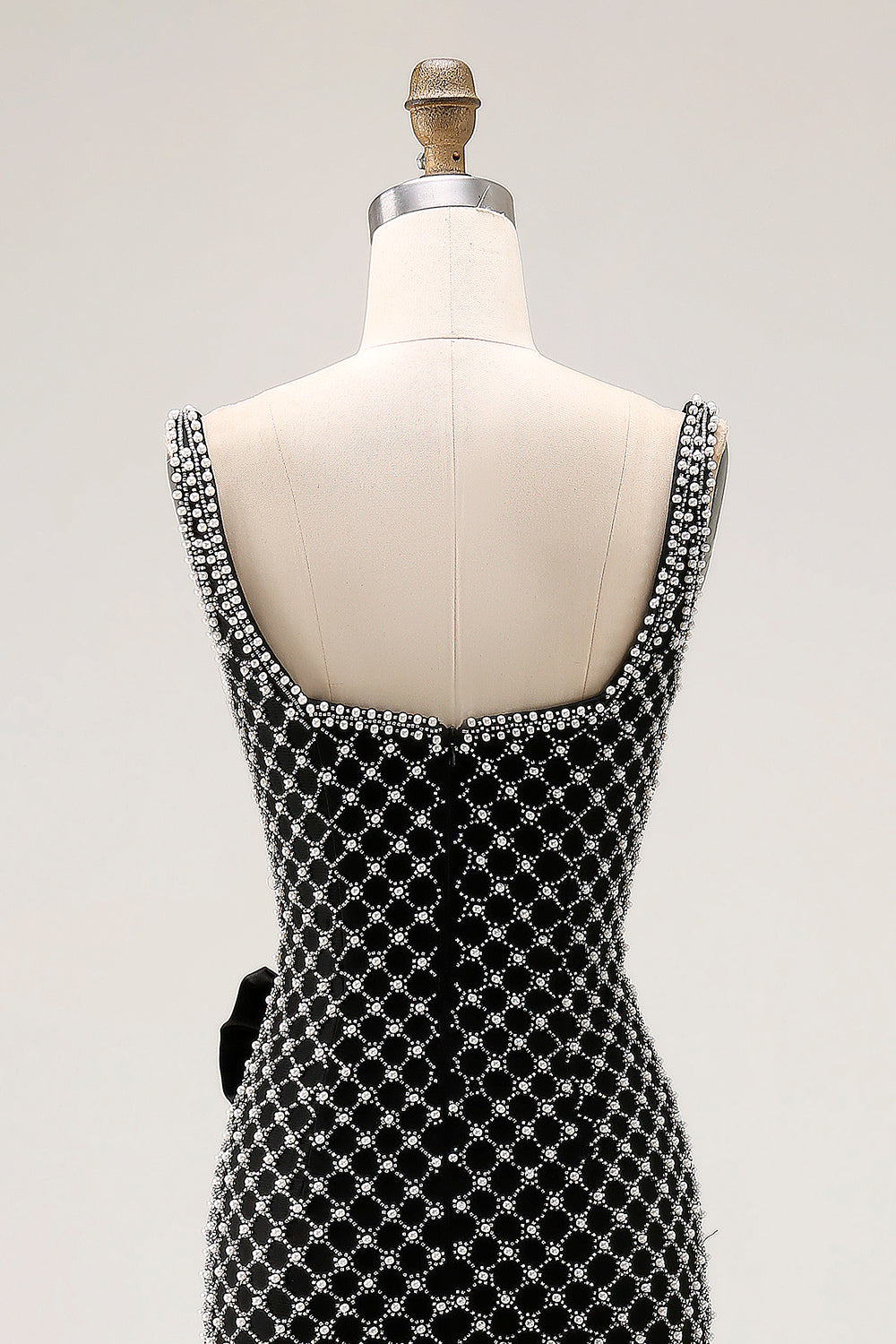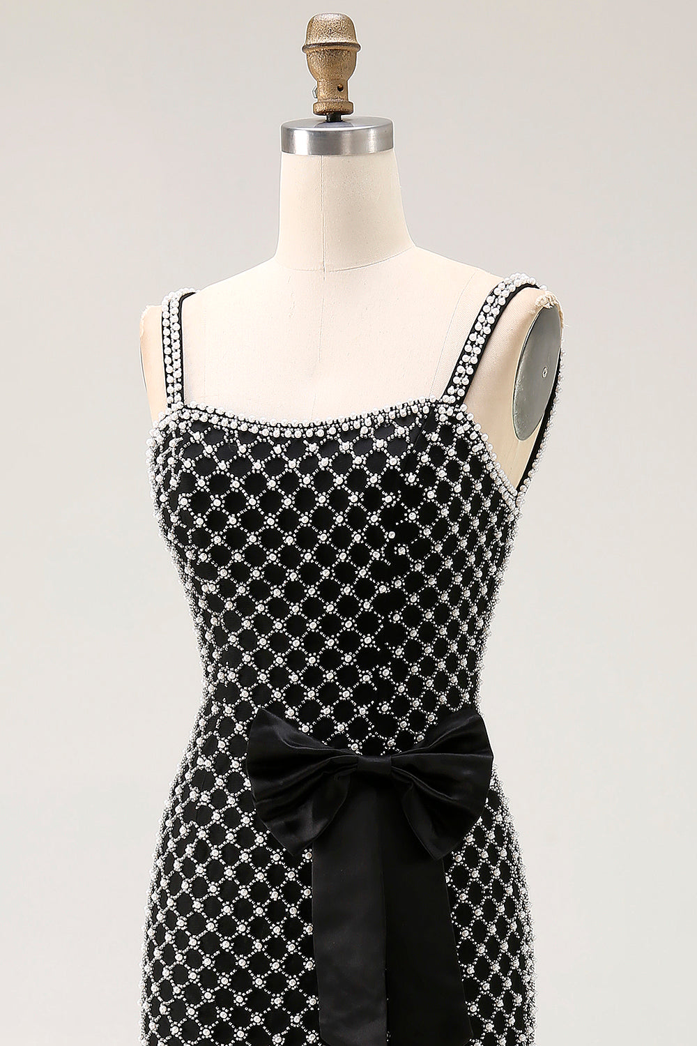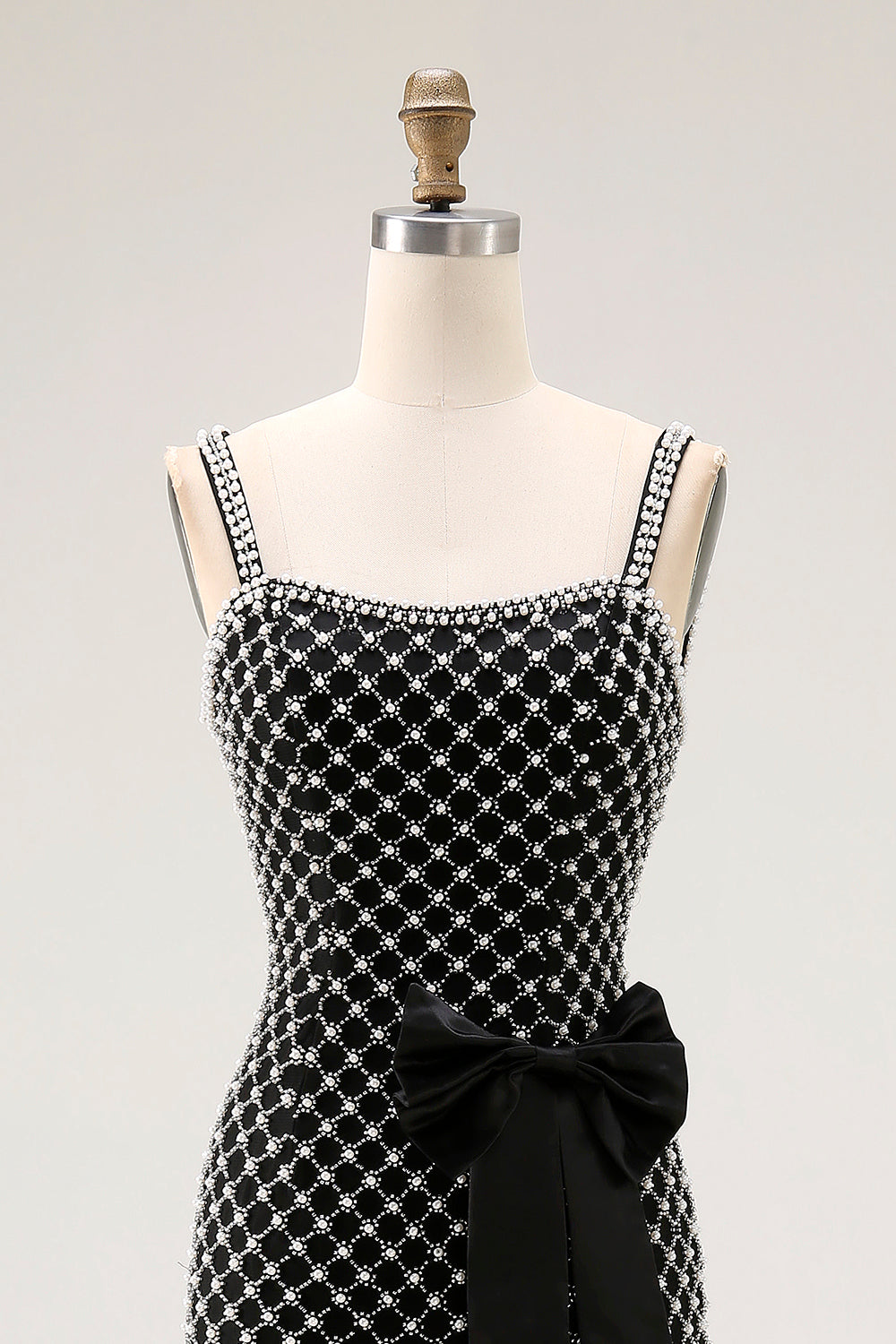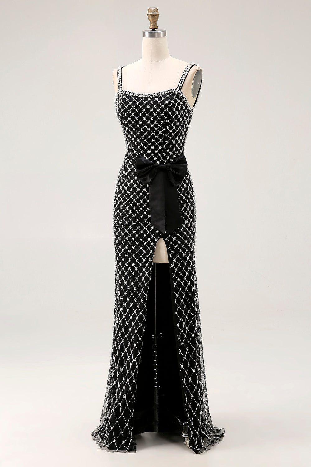 Black Beaded Mermaid Spaghetti Straps Side Bowed Long Prom Dress with Slit