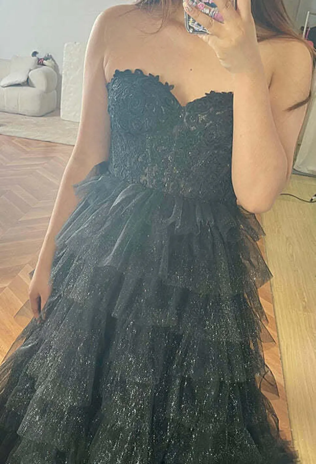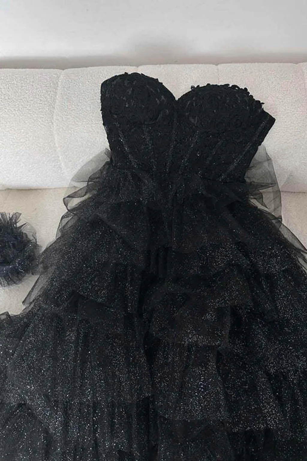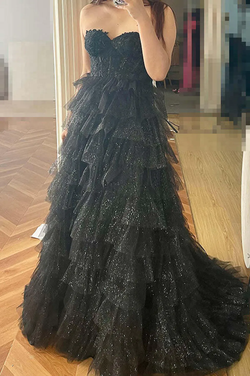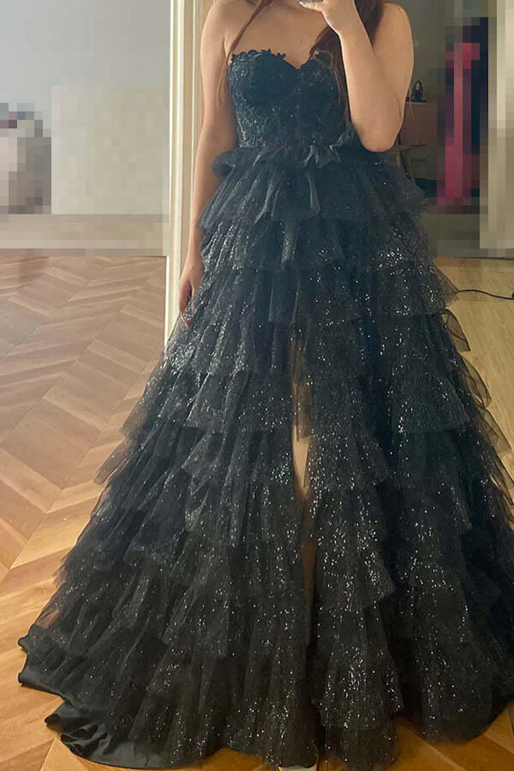 Sparkly Black A Line Long Corset Tiered Tulle Prom Dress With Slit