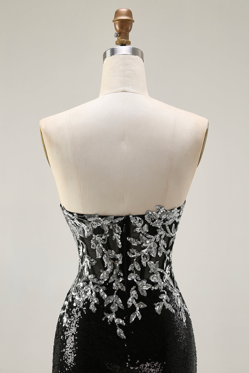 Sparkly Black Silver Mermaid Strapless Corset Sequin Long Prom Dress
