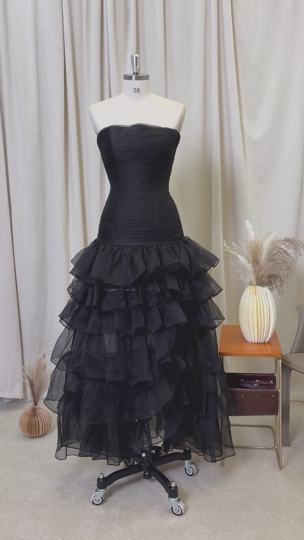 Black Tulle Strapless Tiered Formal Dress with Ruffles