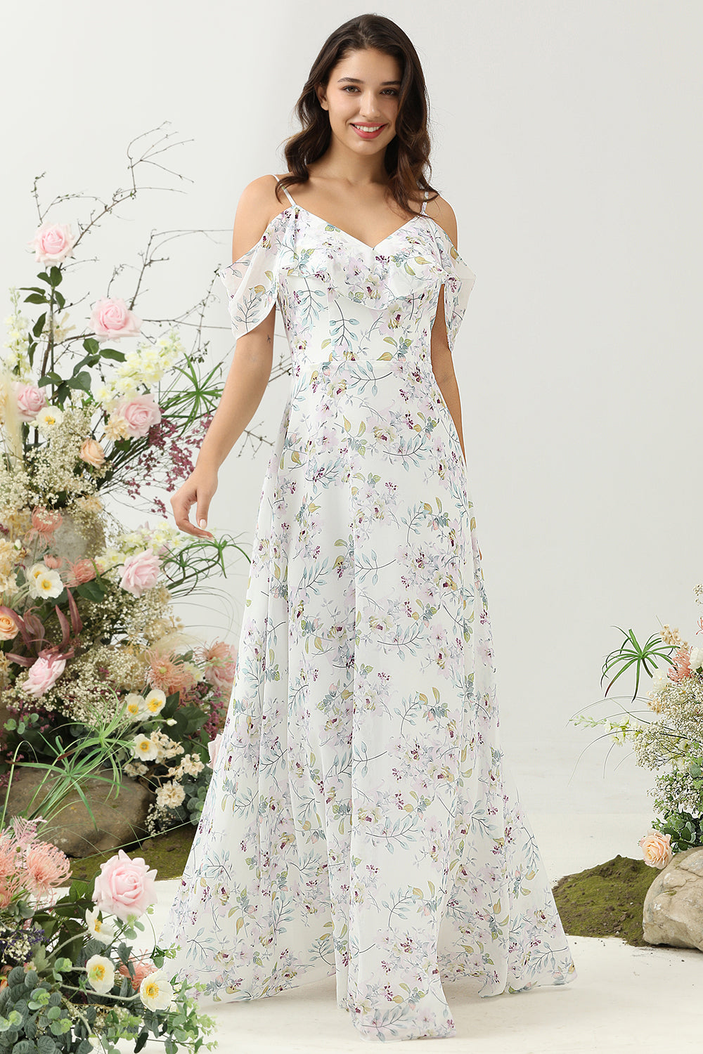 Blue Floral Print A Line Off the Shoulder Long Bridesmaid Dress
