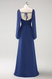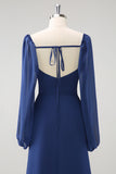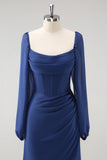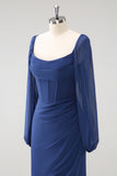 Dark Blue Mermaid Square Neck Pleated Long Sleeves Corset Chiffon Bridesmaid Dress with Slit