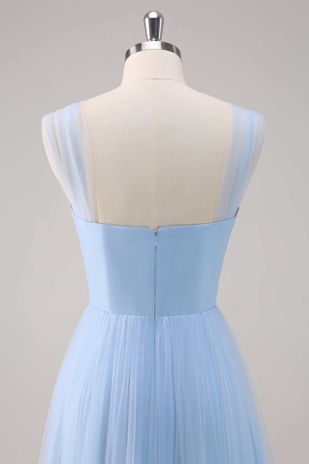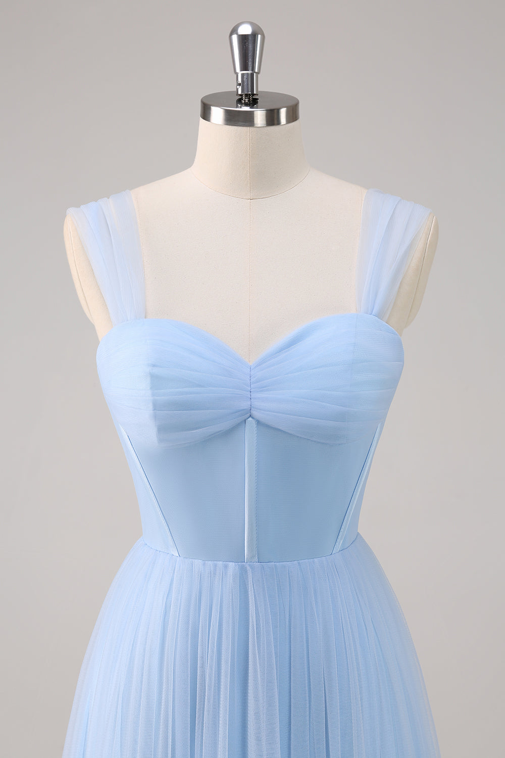 Grey Blue A Line Corset Ruched Long Bridesmaid Dress with Ruffles