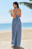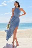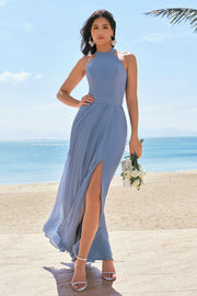 Grey Blue A-Line Halter Lace Up Back Pleated Long Bridesmaid Dress with Slit