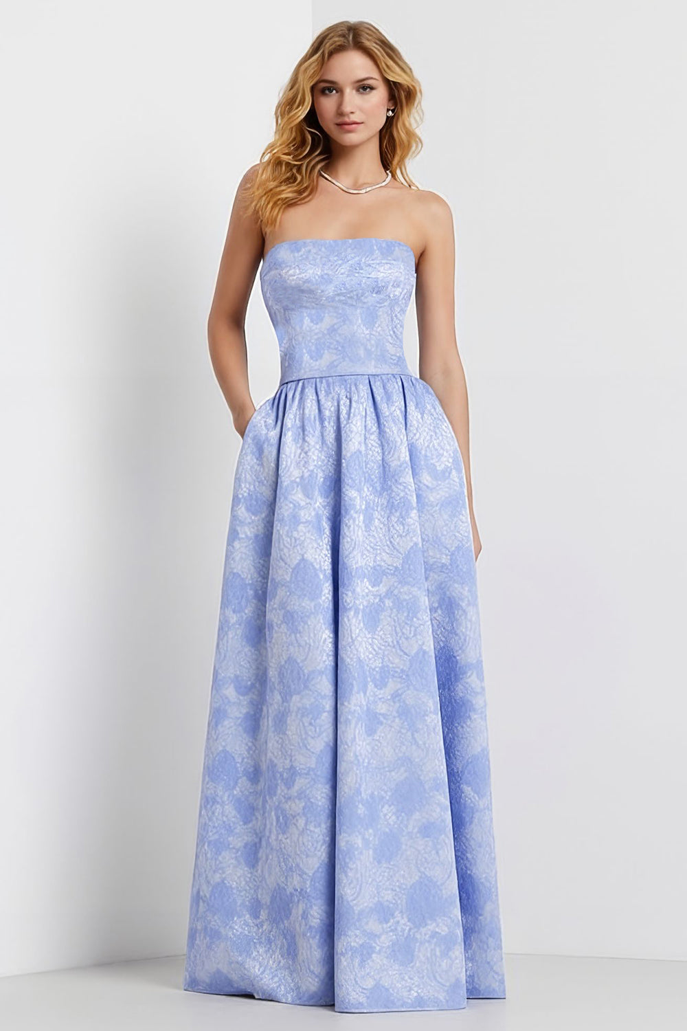 Strapless Light Blue A-Line Satin Floral Long Jacquard Dress with Pocket