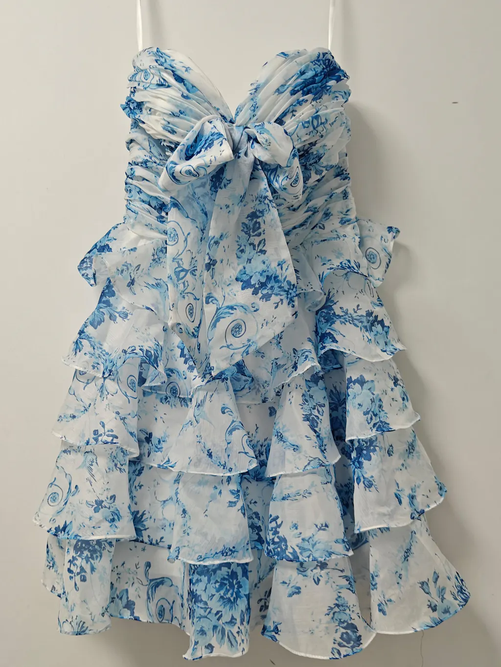 Strapless White Blue Flower A-line Tiered Short Homecoming Dress with Bow