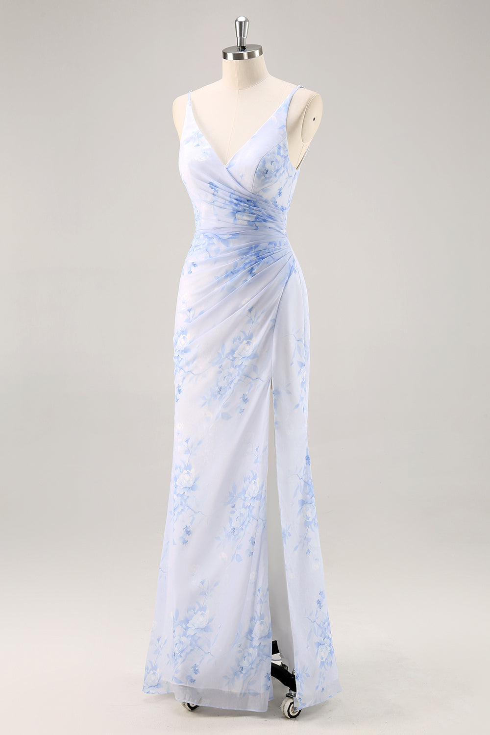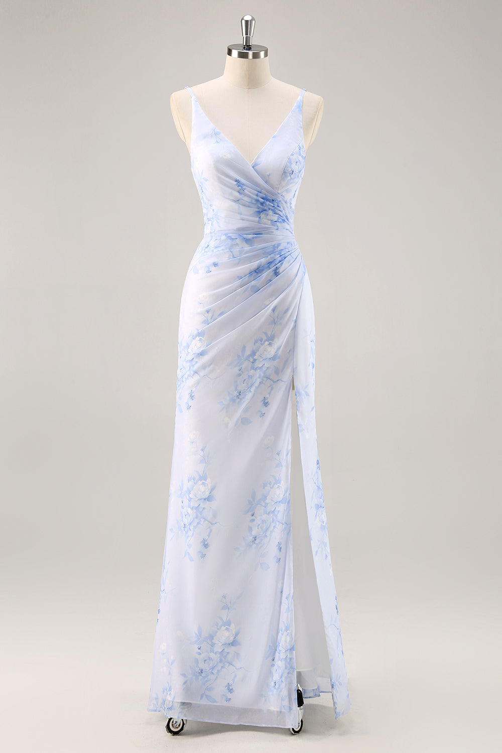 Blue Flower Sheath V Neck Ruched Long Bridesmaid Dress with Slit