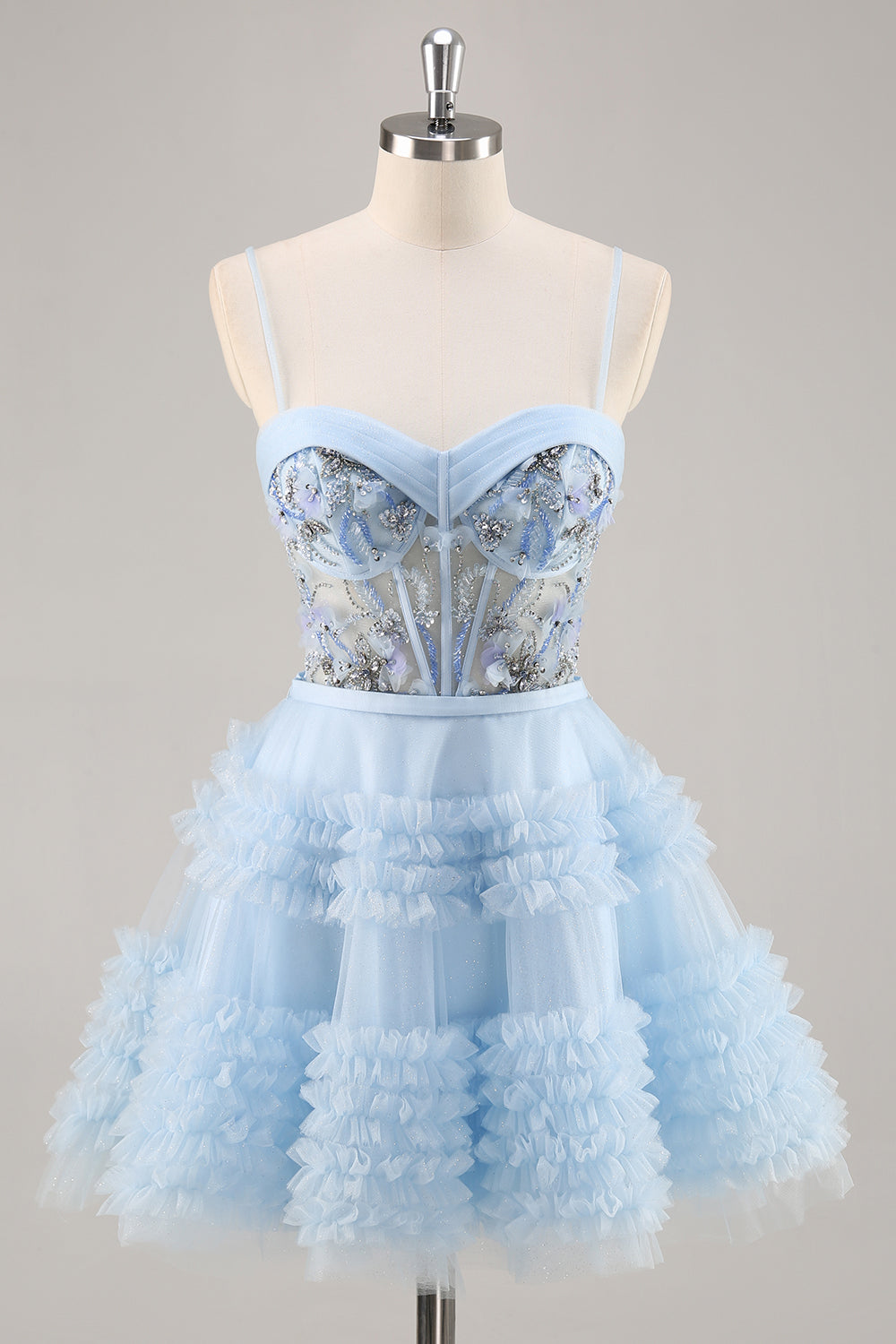 A-Line Sequins Tulle Corset Pleated Short Blue Homecoming Dress with Ruffles