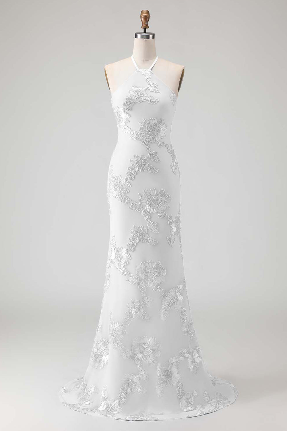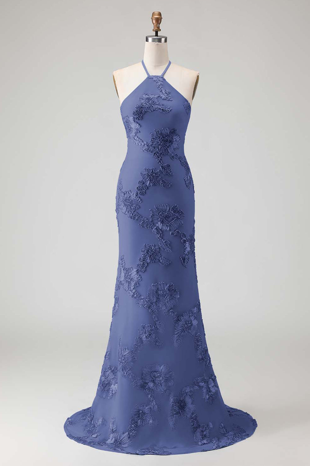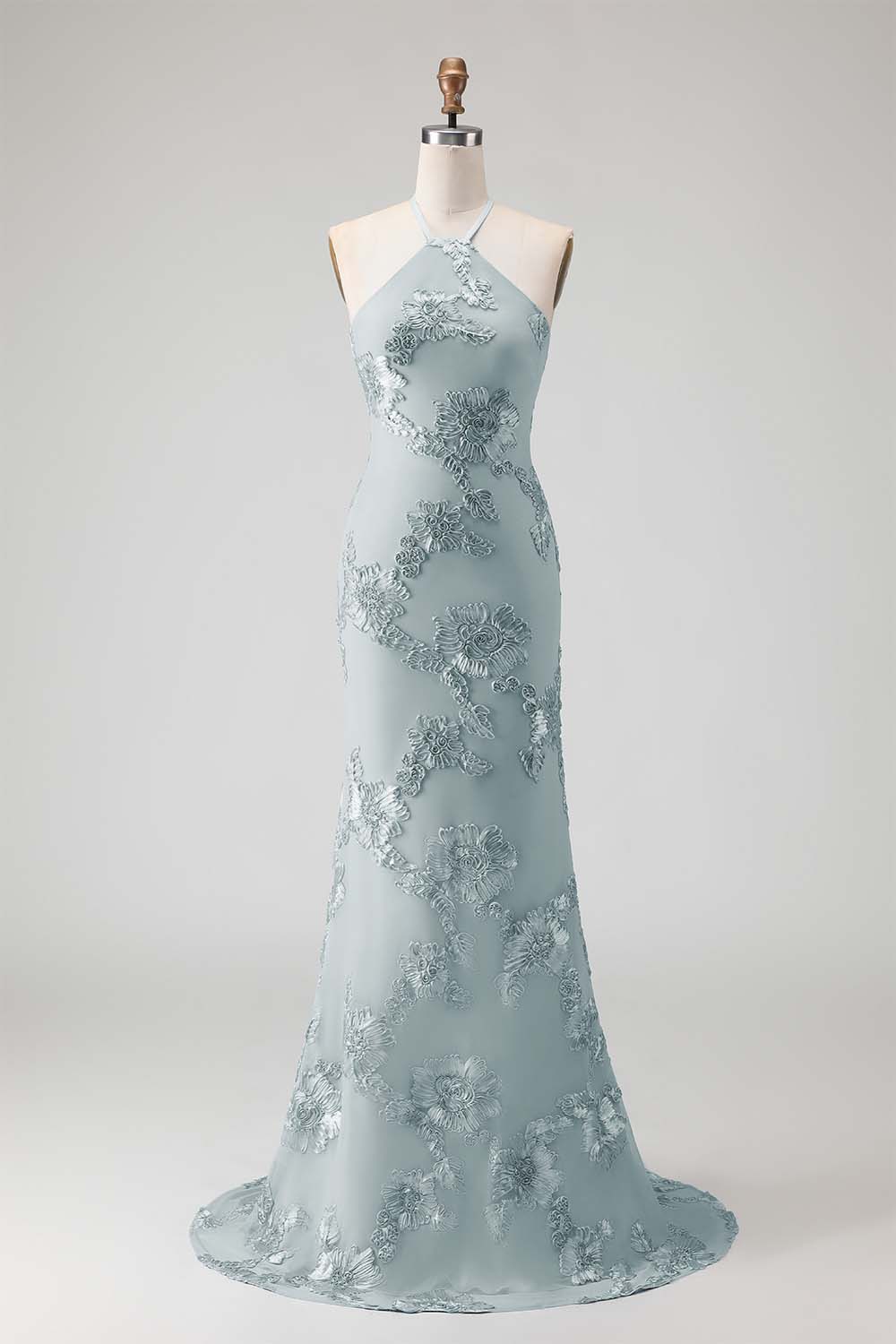 Light Blue Halter Mermaid Open Back Long Prom Dress with Appliques