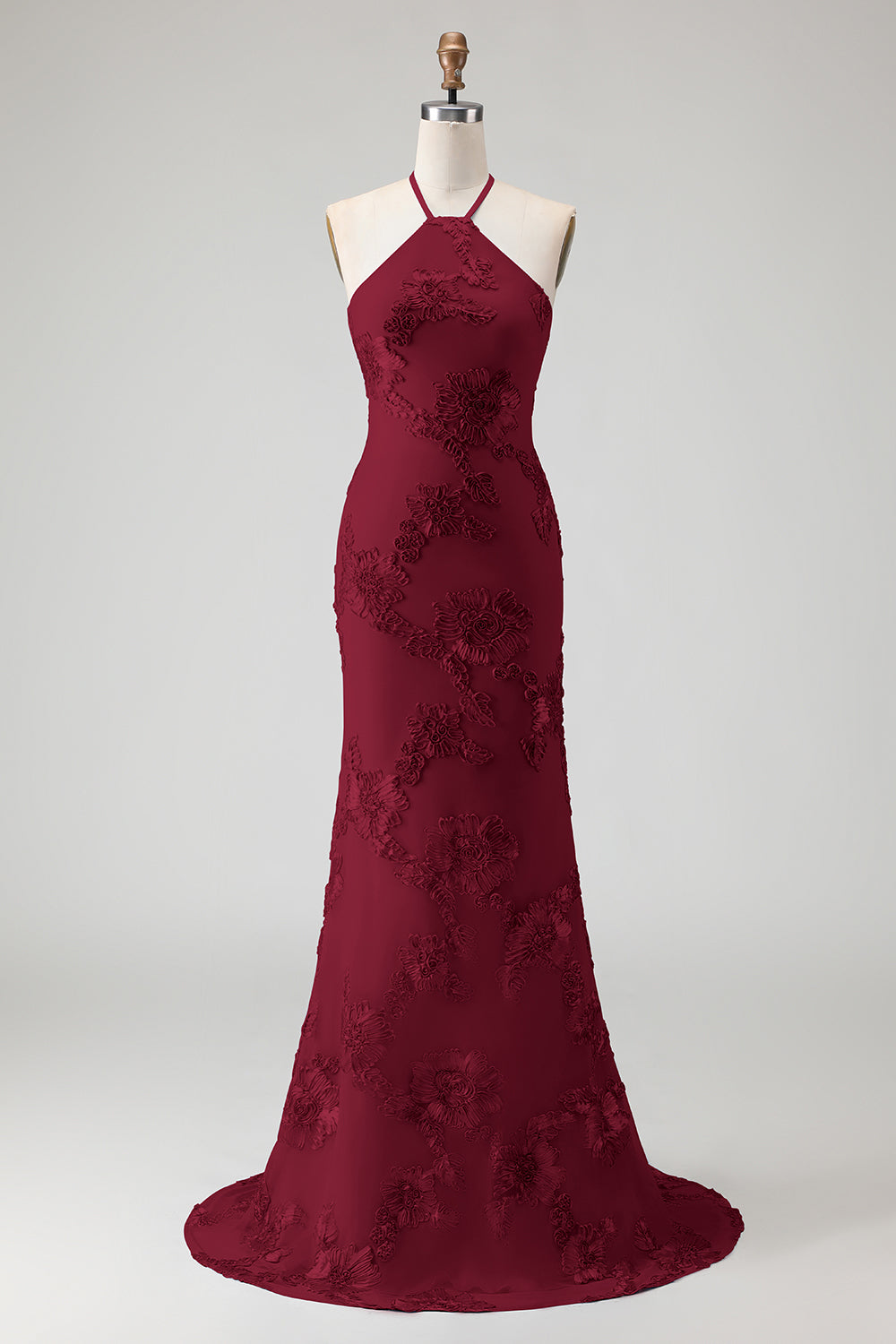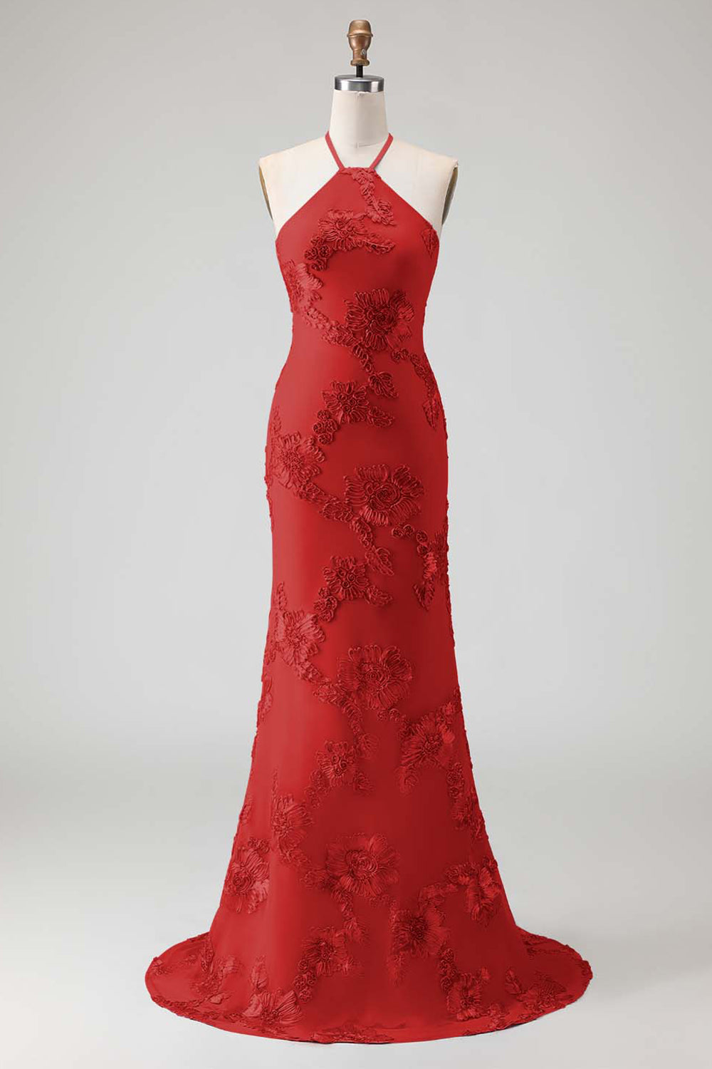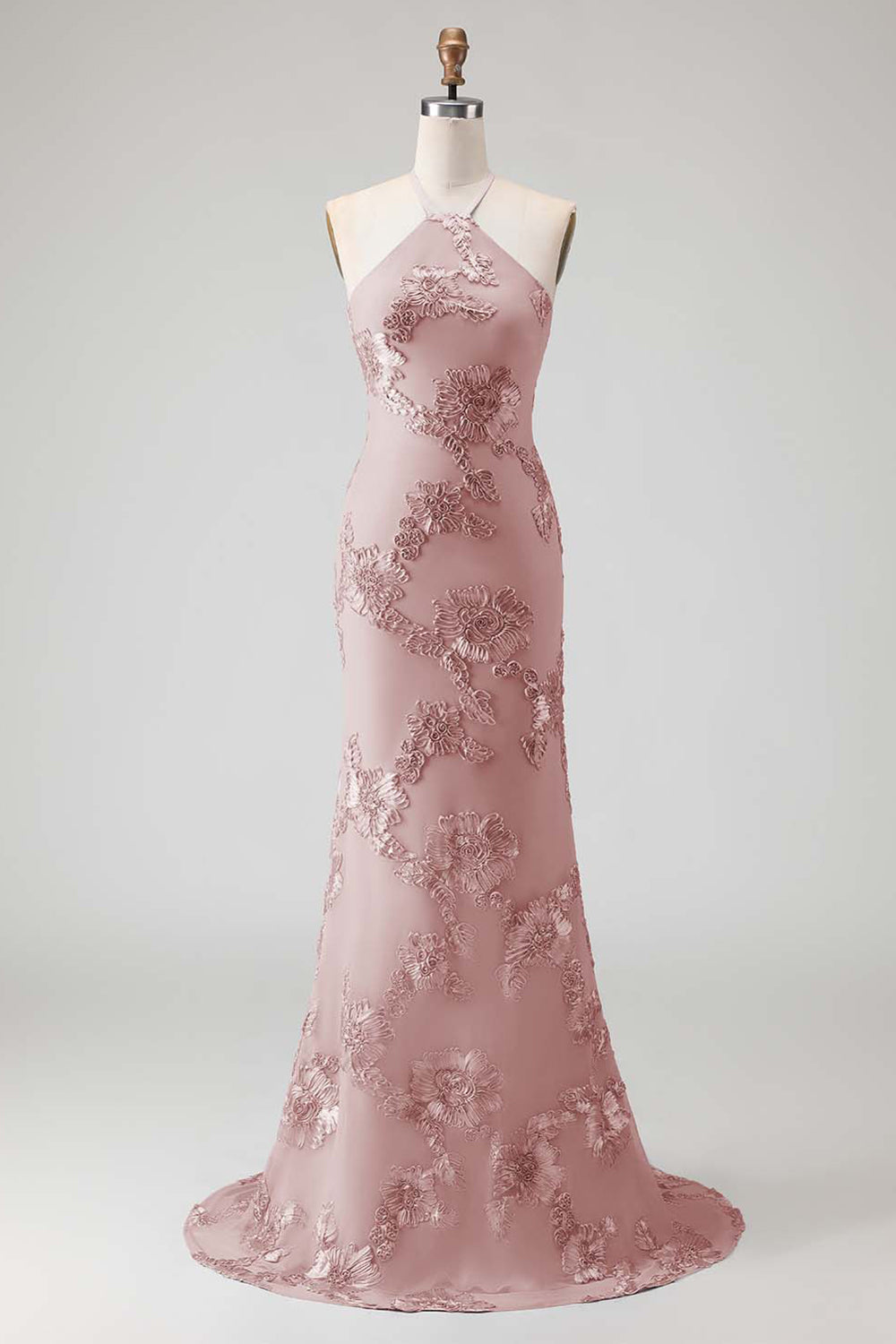 Light Blue Halter Mermaid Open Back Long Prom Dress with Appliques