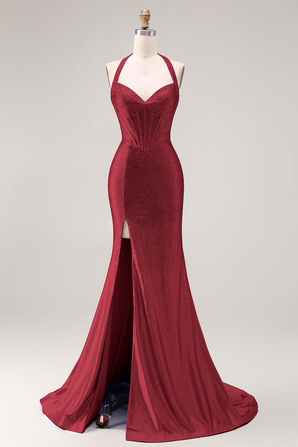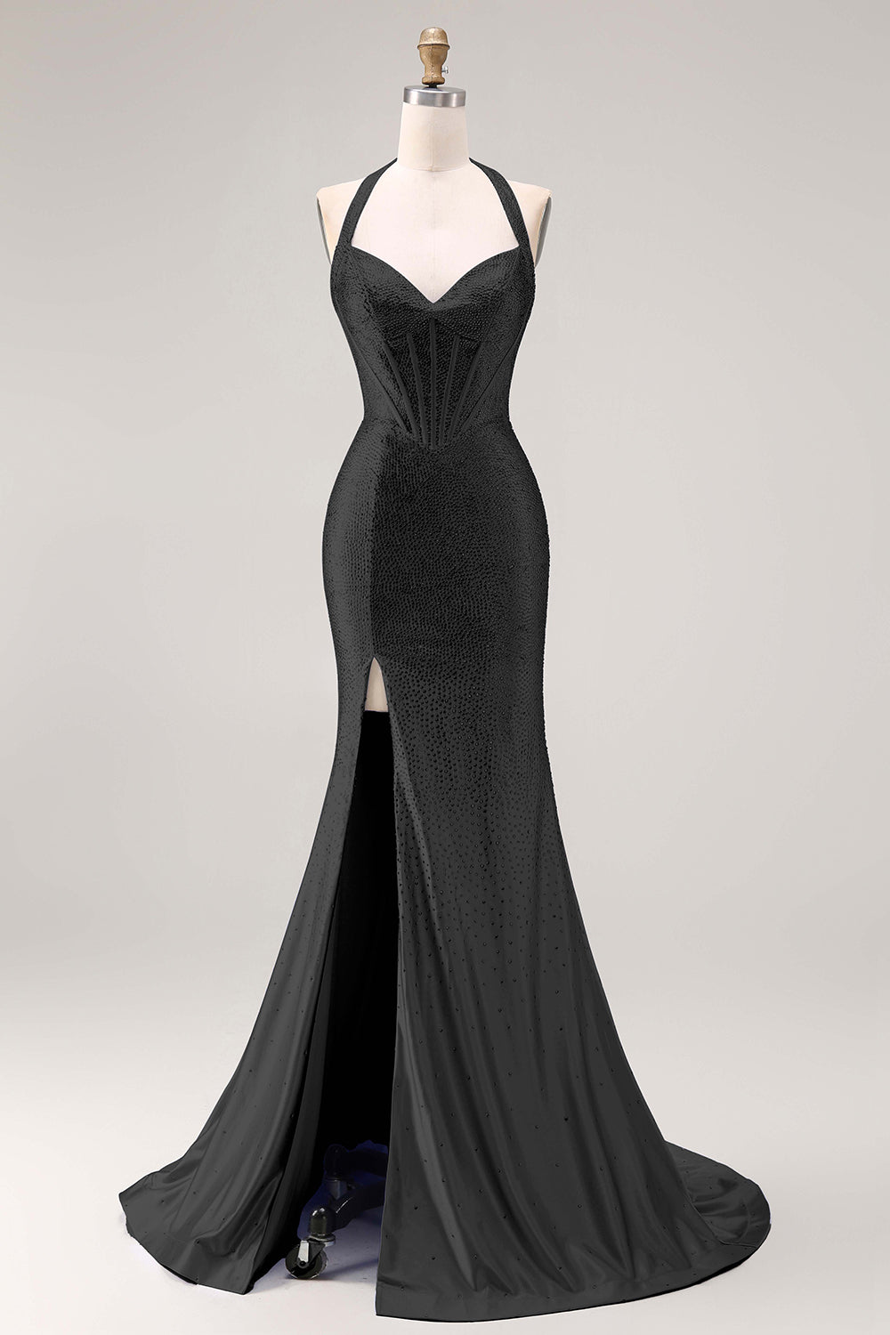 Light Blue Mermaid Beaded Halter Corset Long Prom Dress with Slit