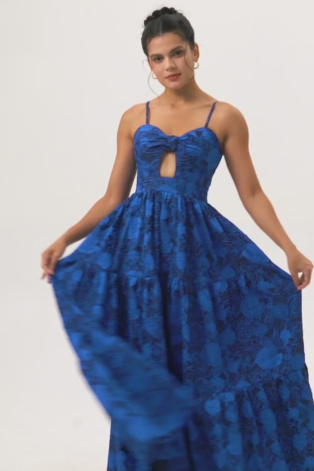 A-Line Cut-Out Dark Blue Maxi Rose Floral Jacquard Dress with Pockets