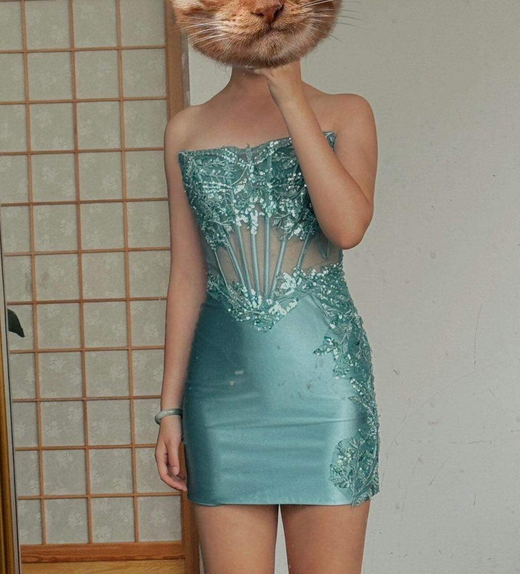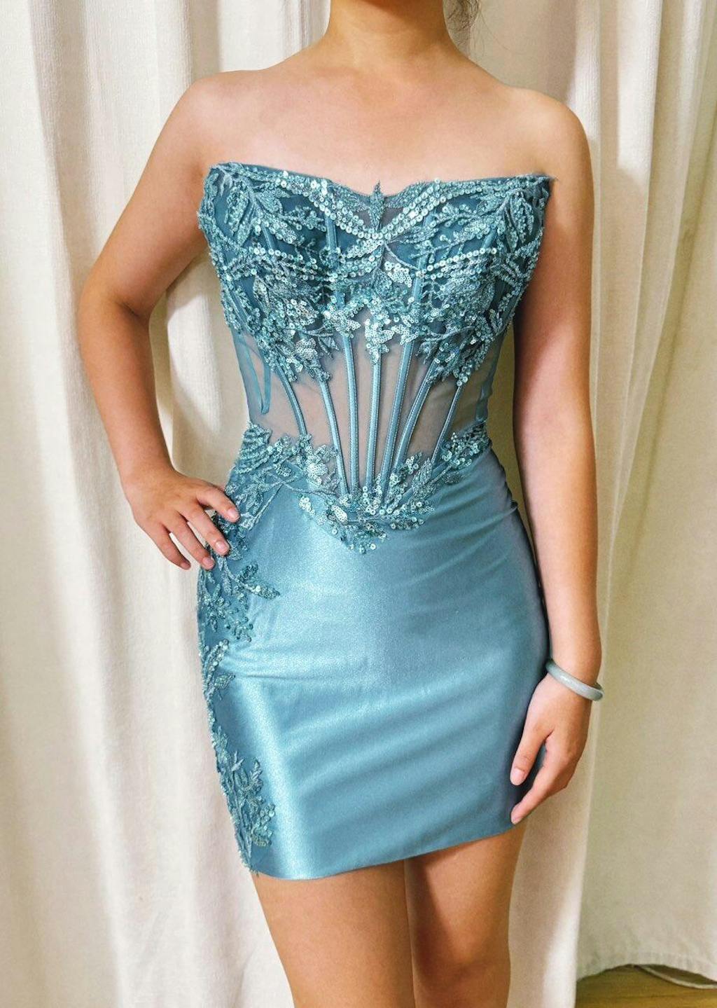 Glitter Tight Strapless Corset Short Peacock Blue Homecoming Dress with Appliques