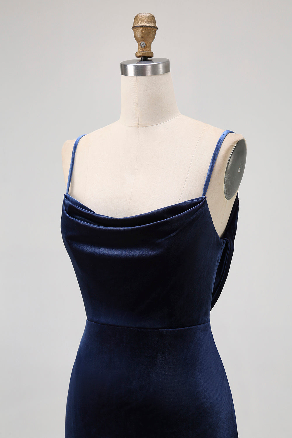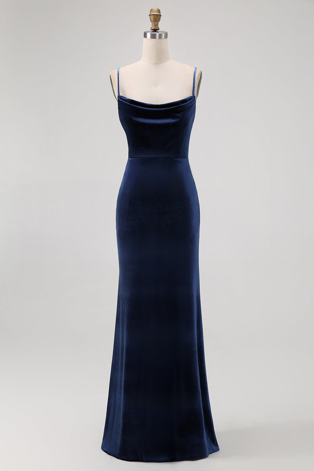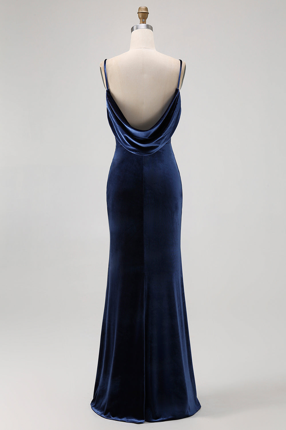 Dark Blue Mermaid Cowl Neck Velvet Long Bridesmaid Dress with Open Back