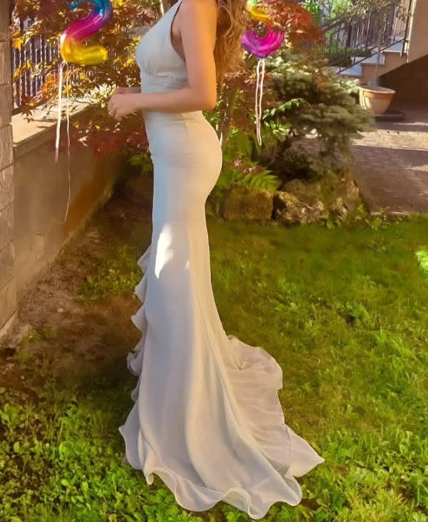 Love the halter neckline! Dress fits amazingly, flows beautifully, and the slit makes walking in it so fun.