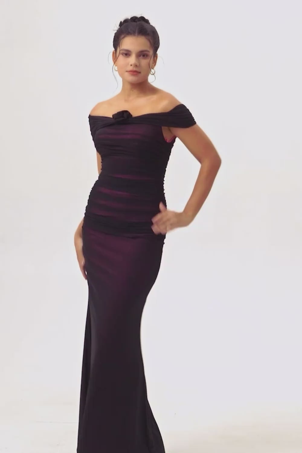 Black Pink Mermaid Off The Shoulder Ruched Tulle Long Bridesmaid Dress with Rosette