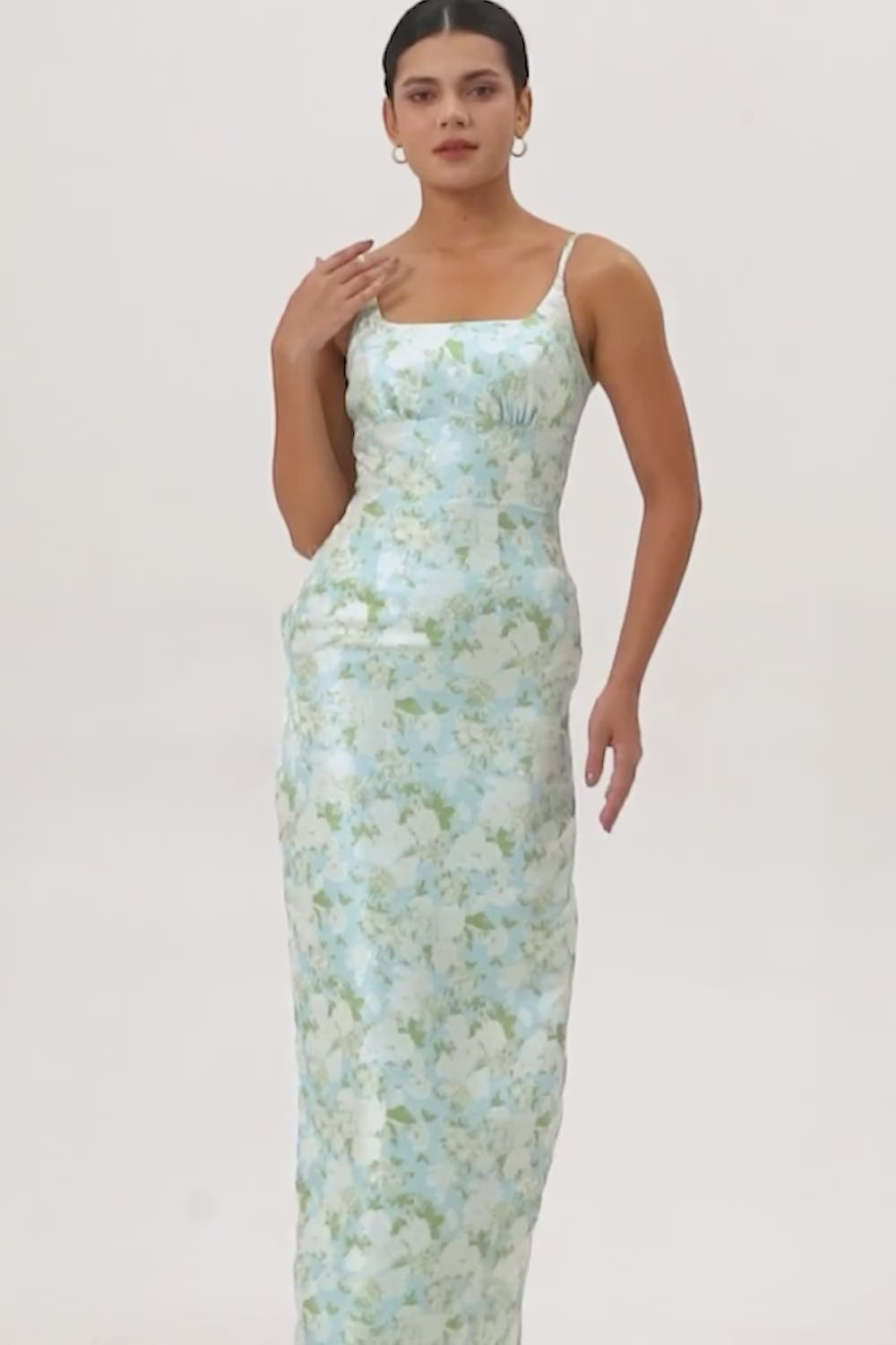 Sheath Blue White Flower Spaghetti Straps Print Long Bridesmaid Dress with Back Slit