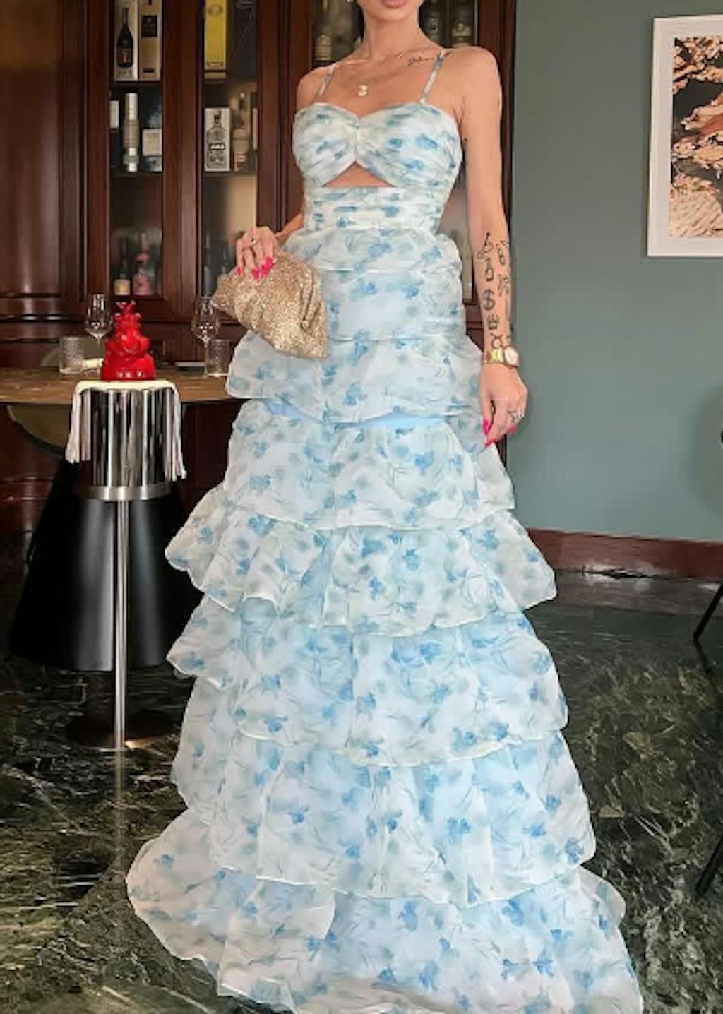 Blue Flower Princess Spaghetti Straps Cut Out Tiered Floor Length Dress