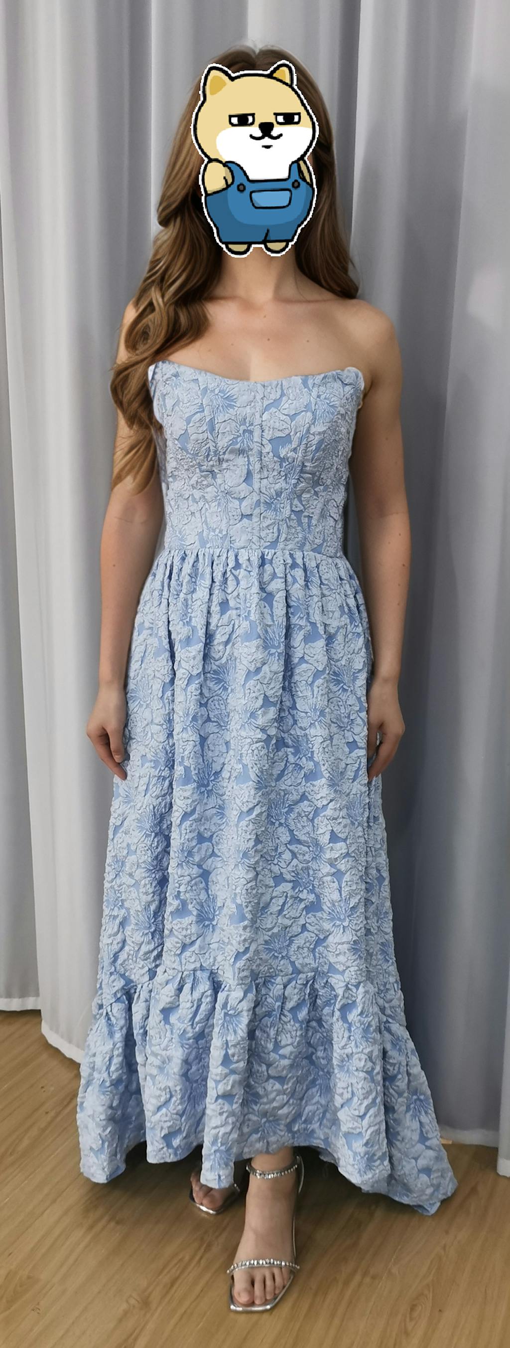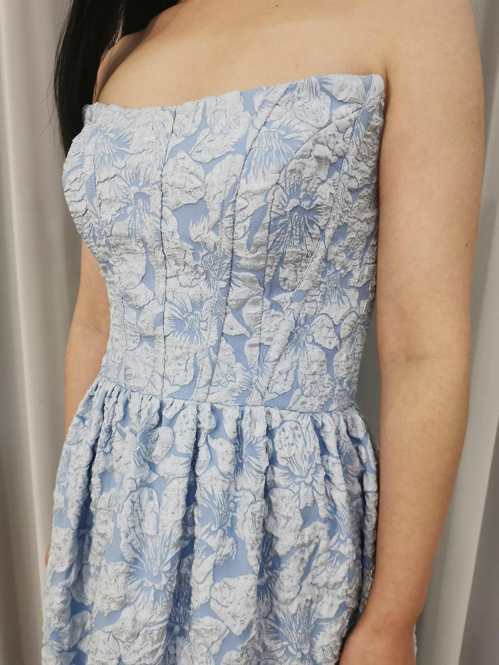 The floral brocade pattern is eye-catching, and the A-line shape is very flattering. The high-low hem adds a modern touch, and the strapless style is classic. Loved wearing this!