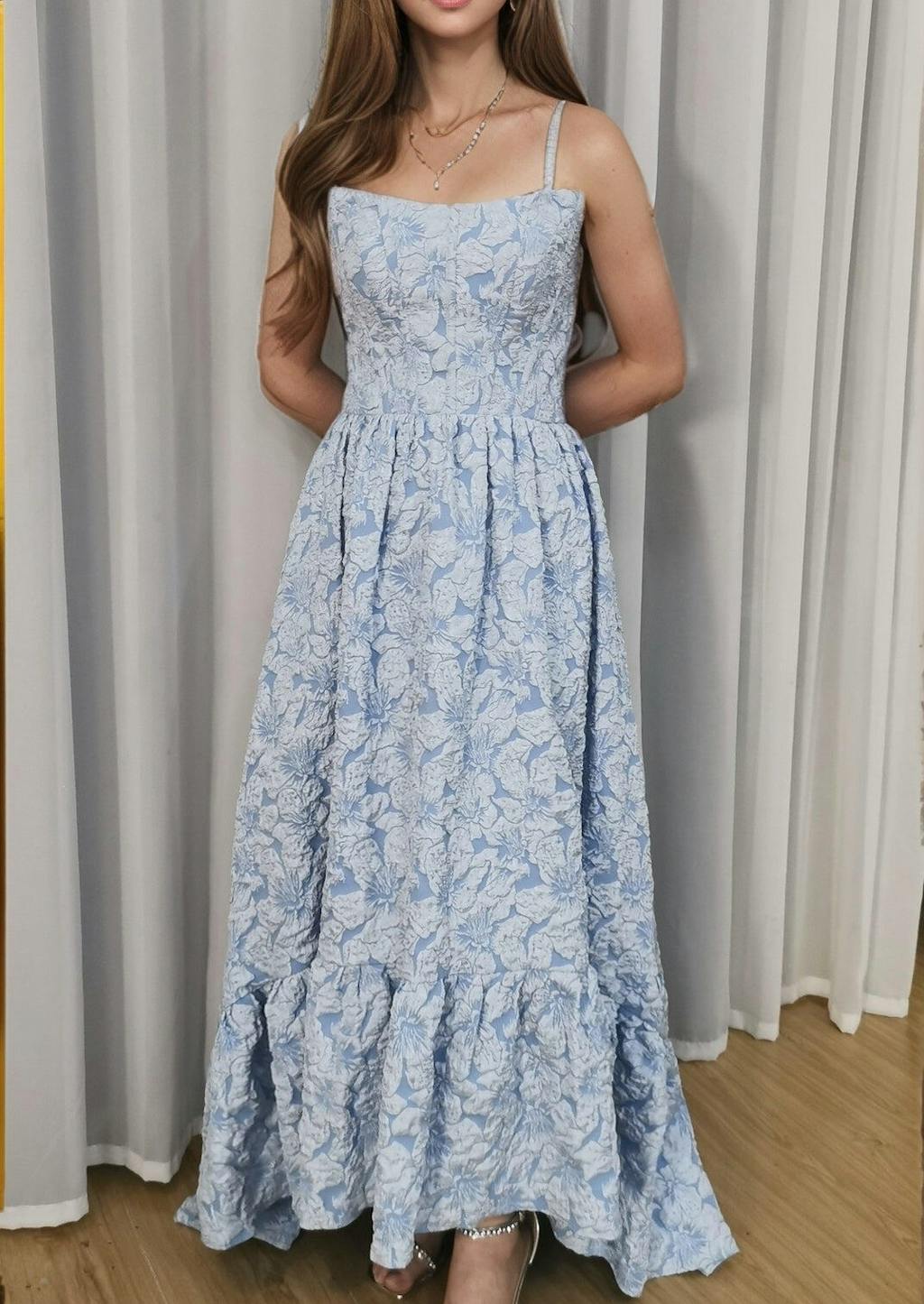 This dress is so beautiful! It's made of a beautiful blue jacquard fabric. It's the perfect length and the design is so unique.