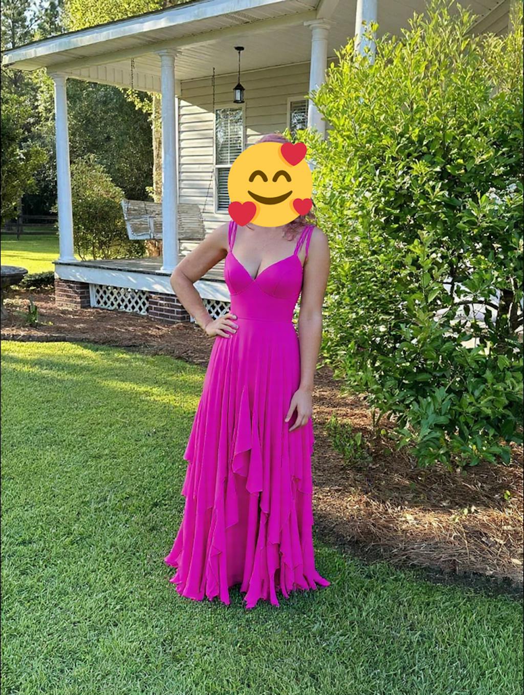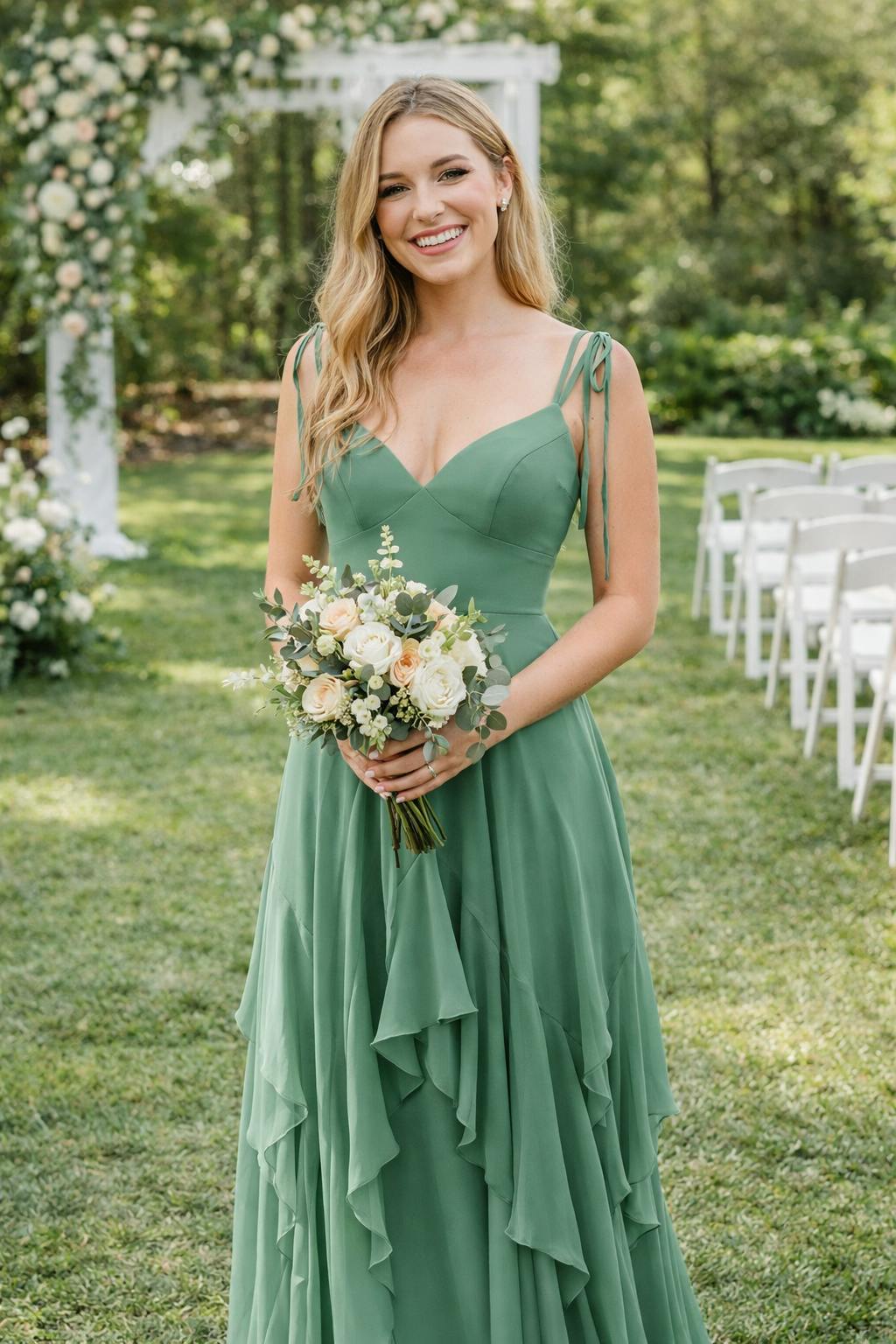 This enchanting bridesmaid dress features a beautiful A-line silhouette that effortlessly flatters all body types. The delicate spaghetti straps add a touch of elegance, while the soft chiffon fabric flows gracefully down into a floor-length hem. The gentle ruffles throughout the skirt add movement and texture, creating a dreamy and romantic look. This dress is the perfect choice for a sophisticated and timeless bridal party.