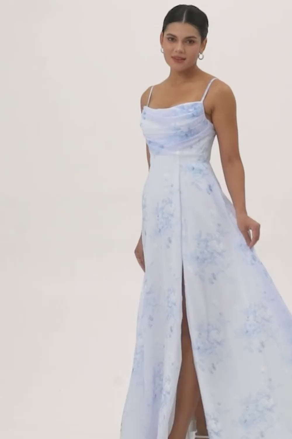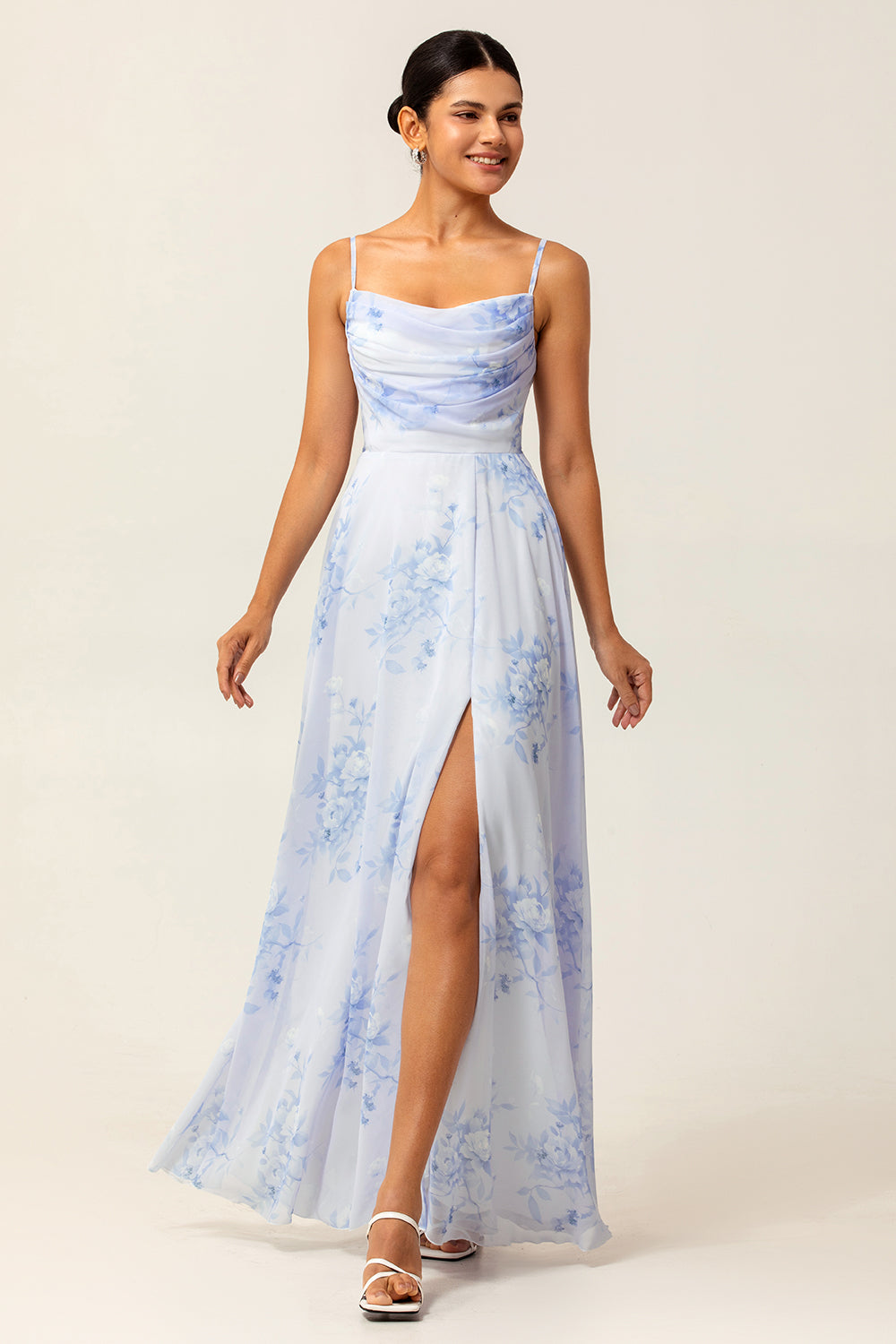 Blue A-Line Spaghetti Straps Print Floral Chiffon Maxi Bridesmaid Dress with Slit