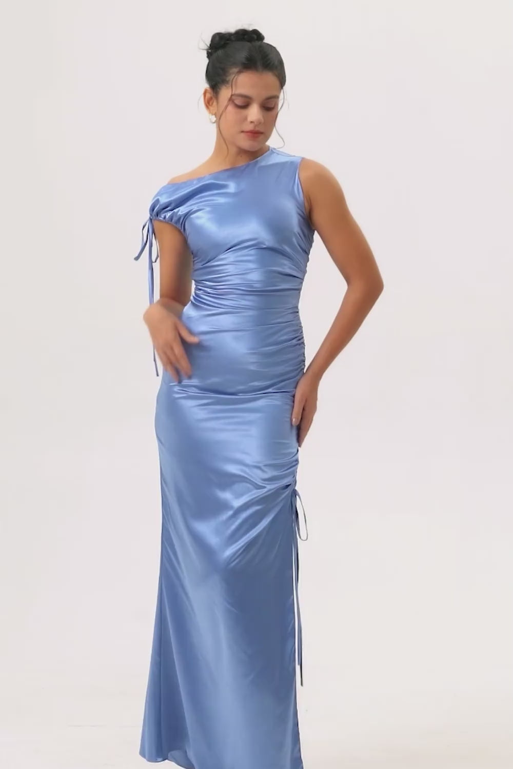 Blue Sheath Drawstring Satin Long Bridesmaid Dress with Slit