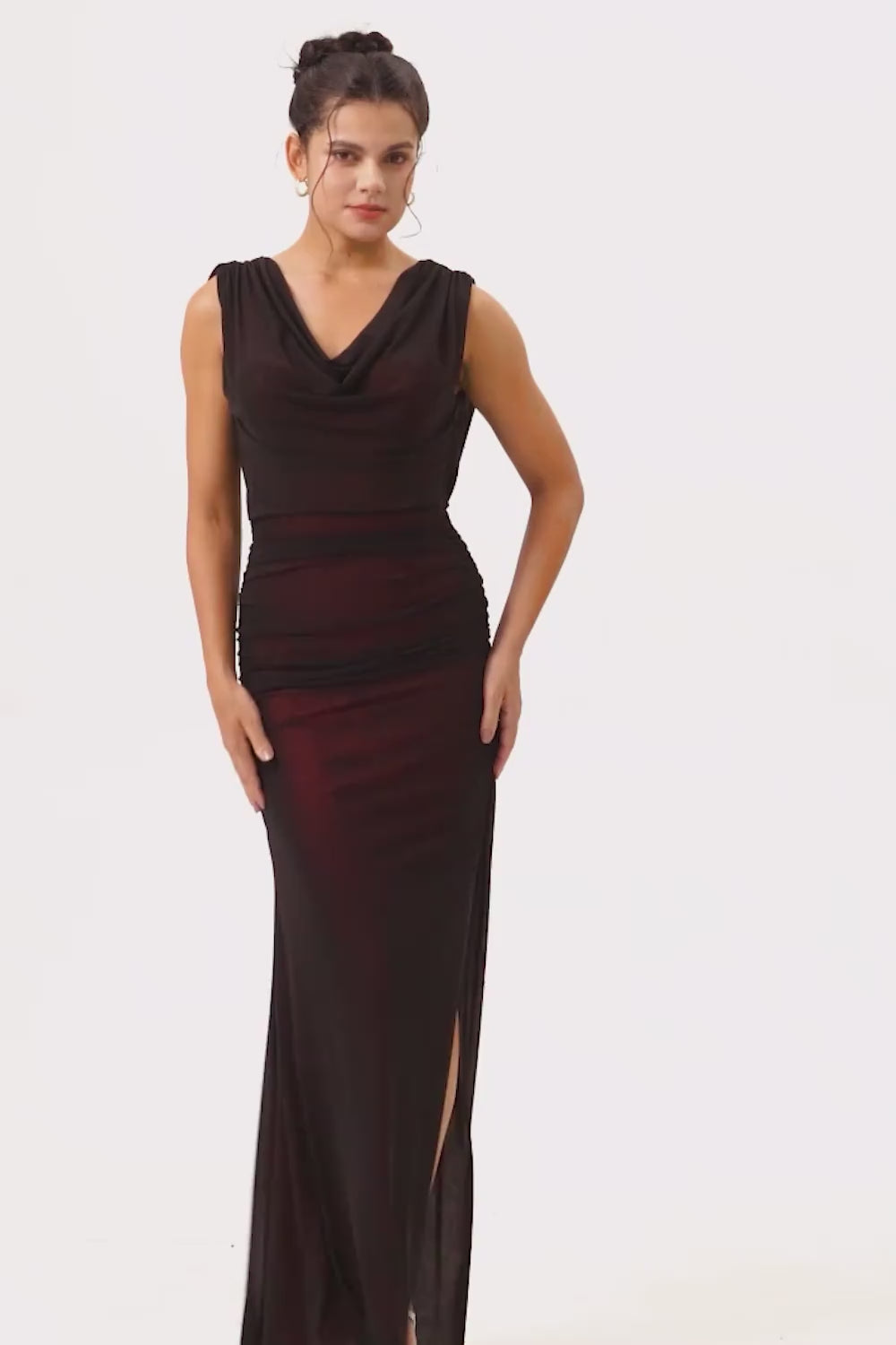 Black Red Sheath Cowl Neck Tulle Open Back Maxi Dress with Slit