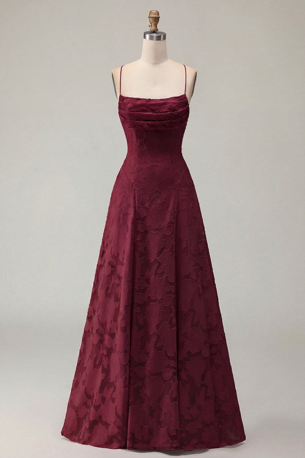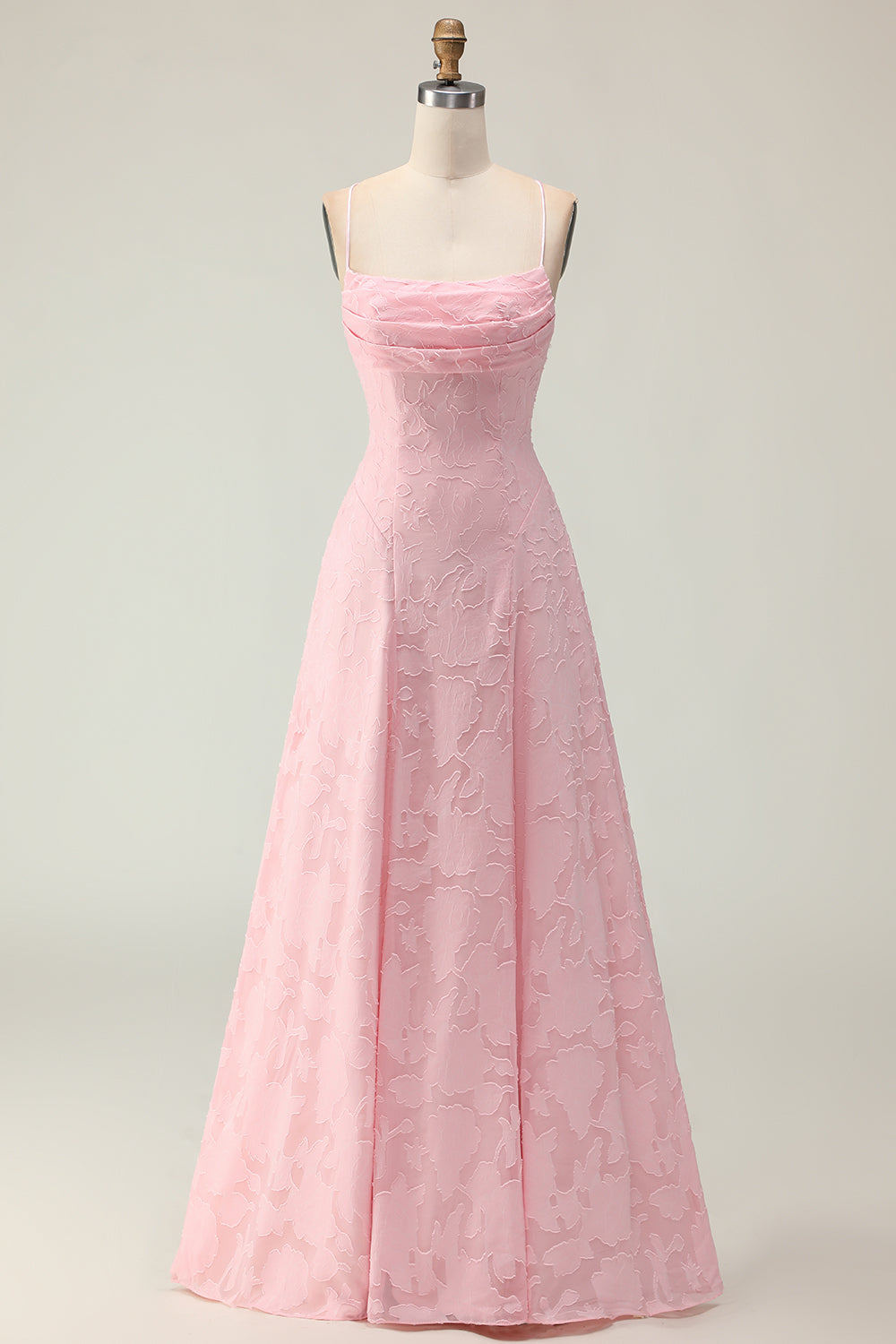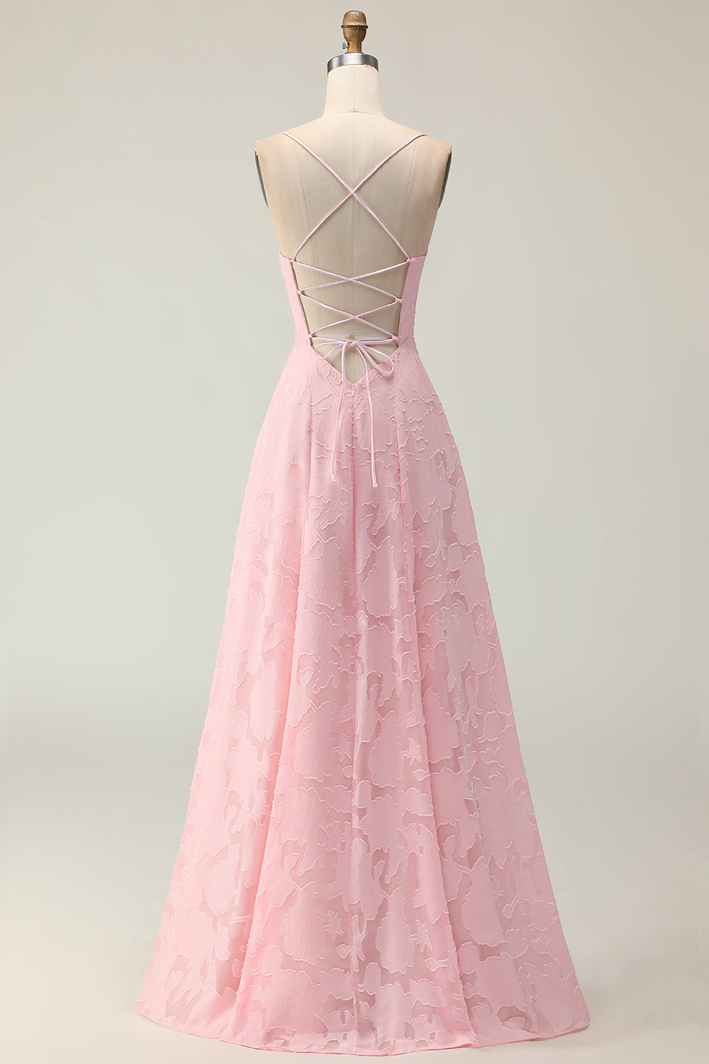 Candy Pink A Line Floral Burnout Long Bridesmaid Dress with Lace Up Back