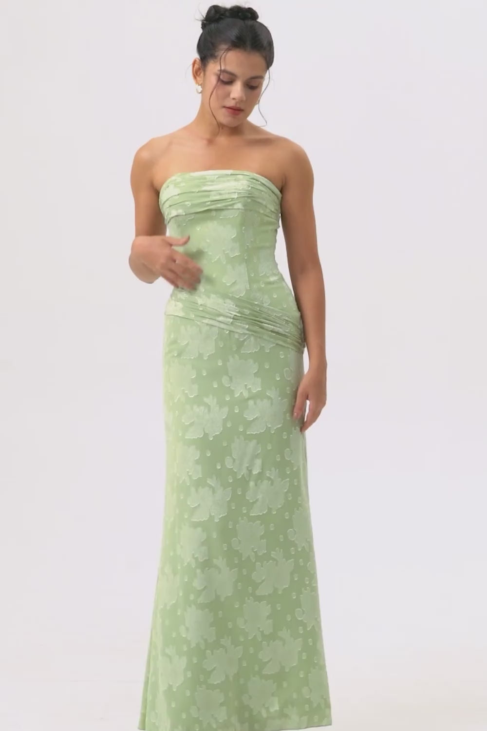 Sage Green Sheath Strapless Ruched Floral Jacquard Long Bridesmaid Dress with Side Slit