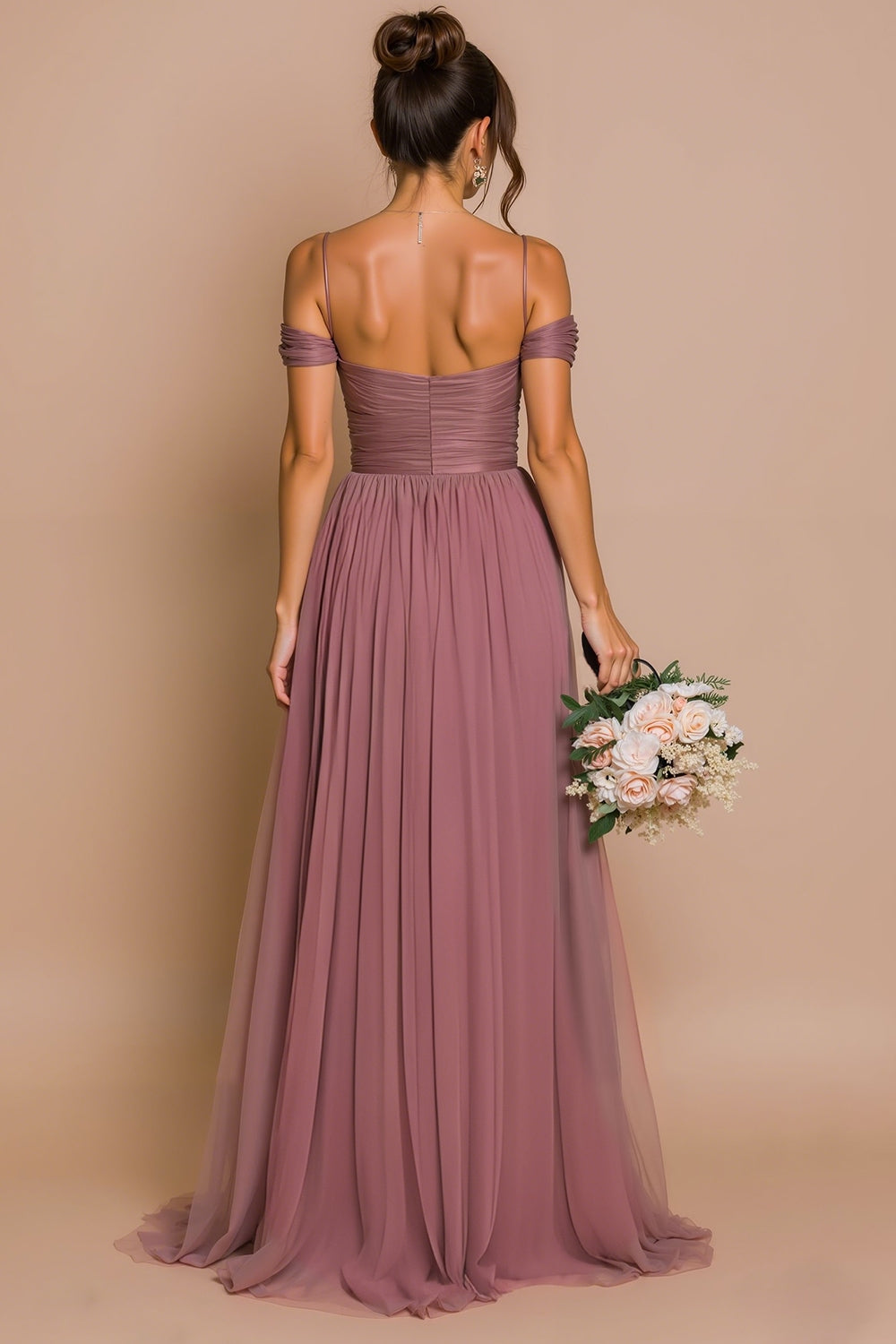 Cold Shoulder A Line Desert Rose Ruched Chiffon Bridesmaid Dress with Slit