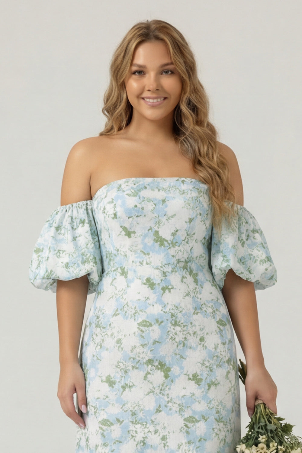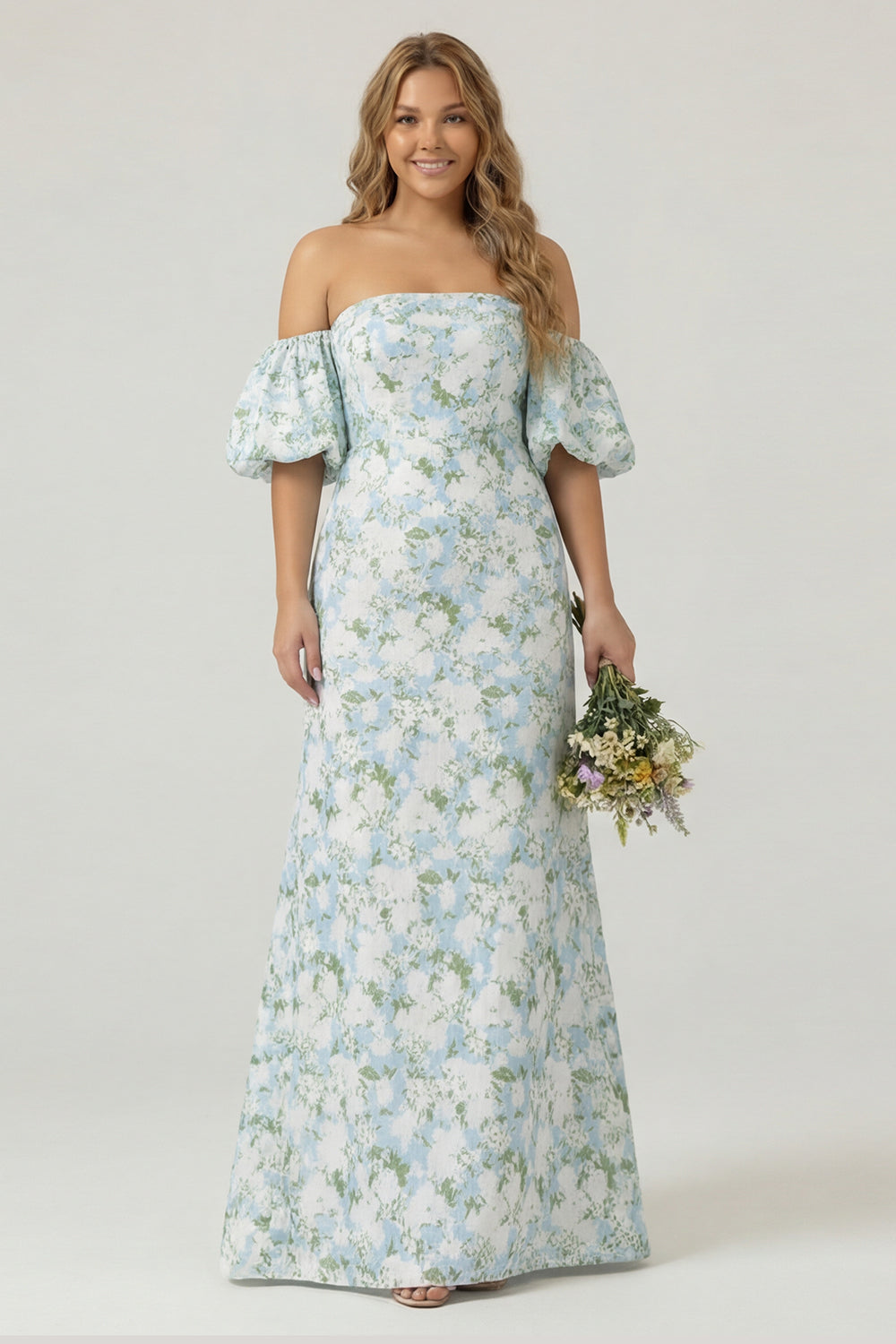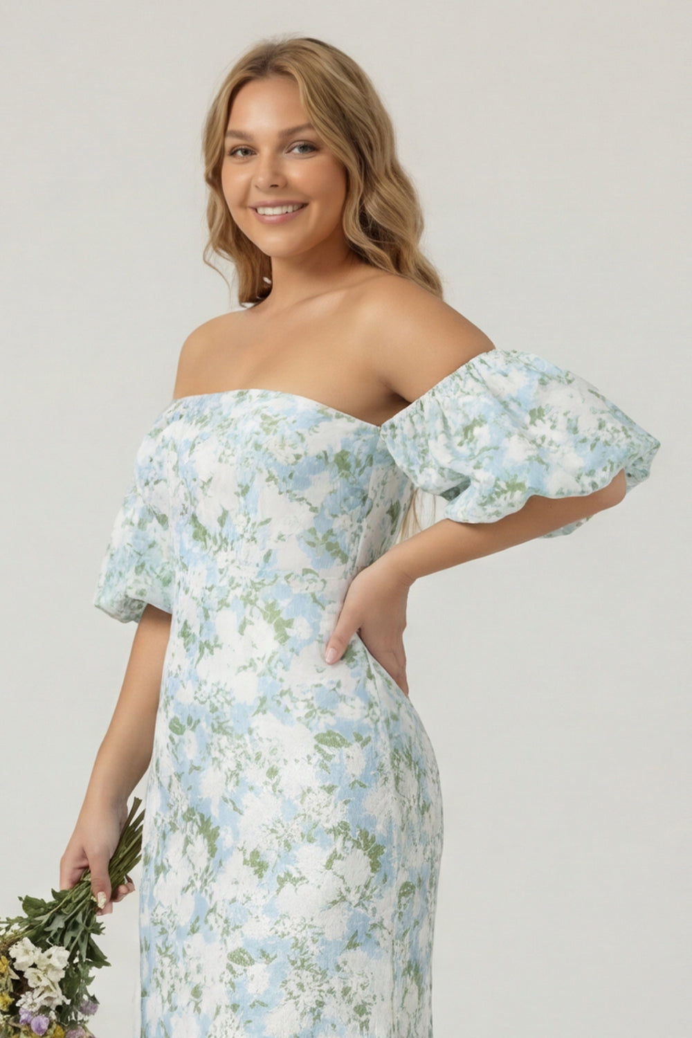 Blue White Flower Mermaid Strapless Satin Plus Size Bridesmaid Dress with Removable Sleeves