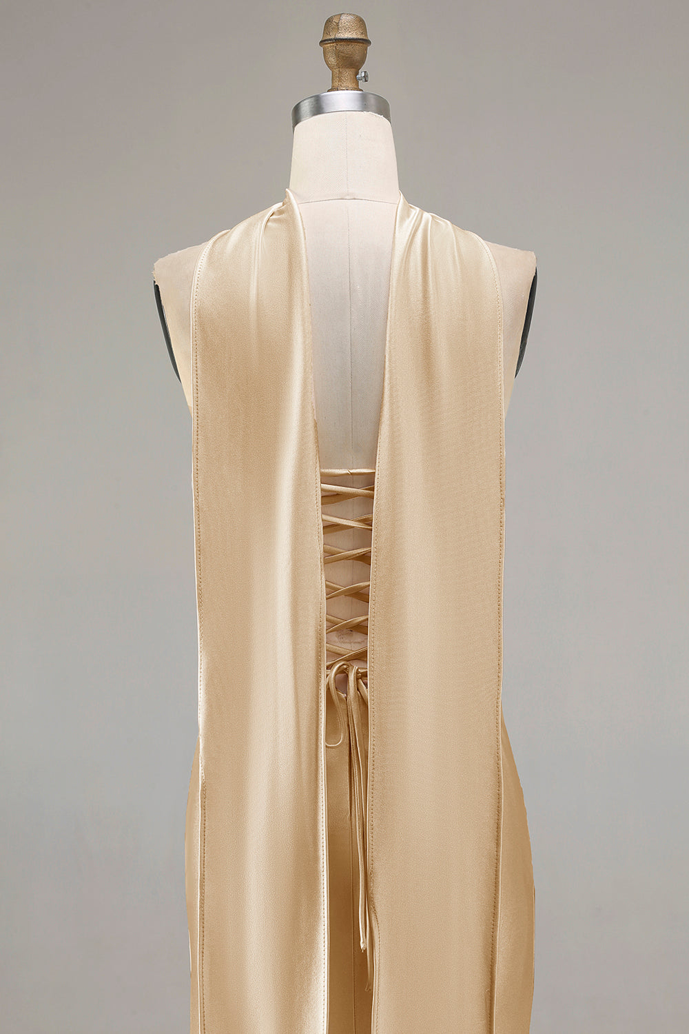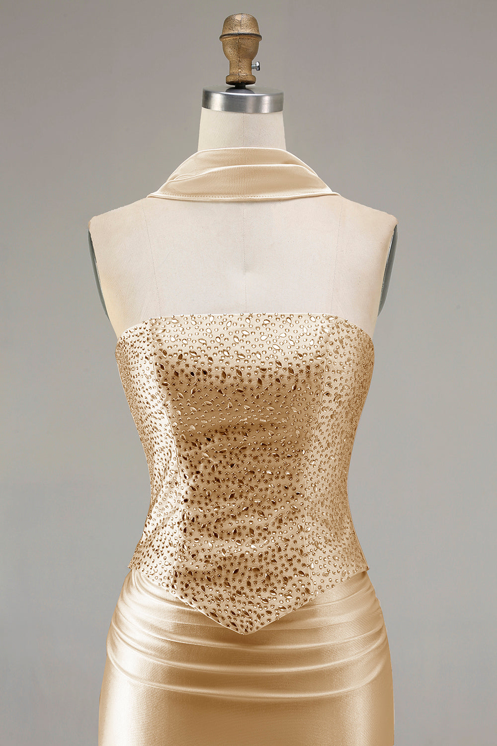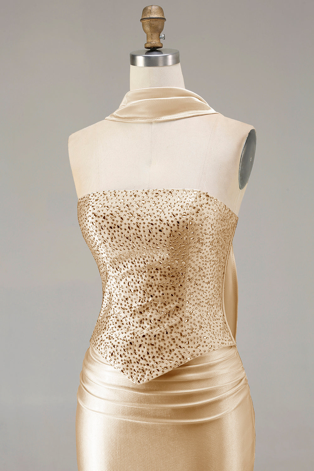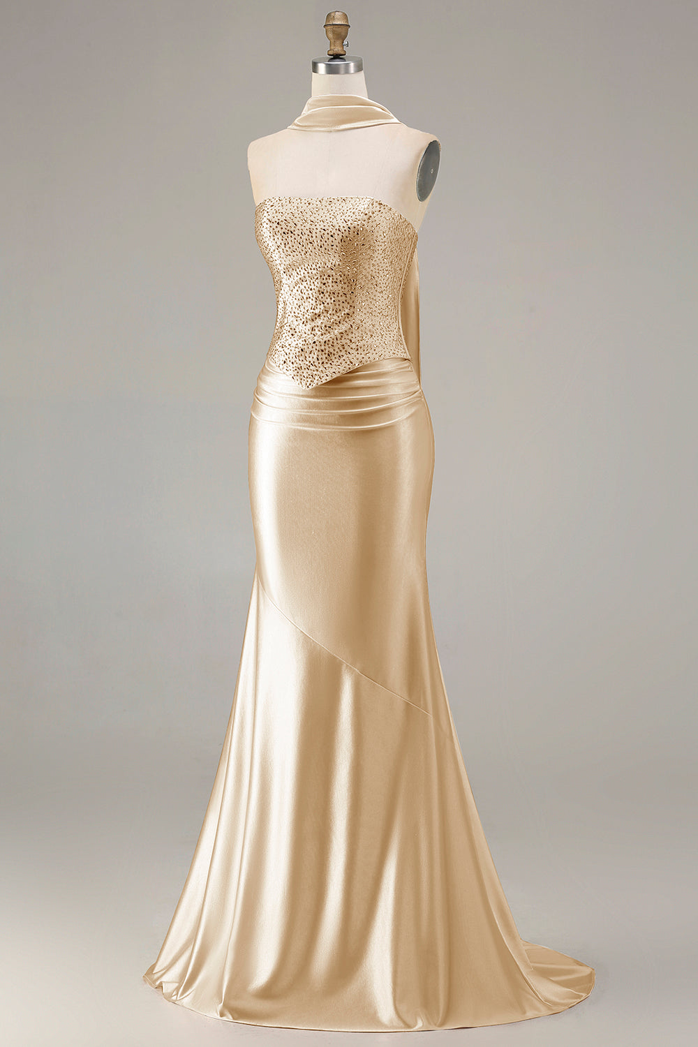 Champagne Mermaid Strapless Beaded Convertible Lace Up Back Long Prom Dress