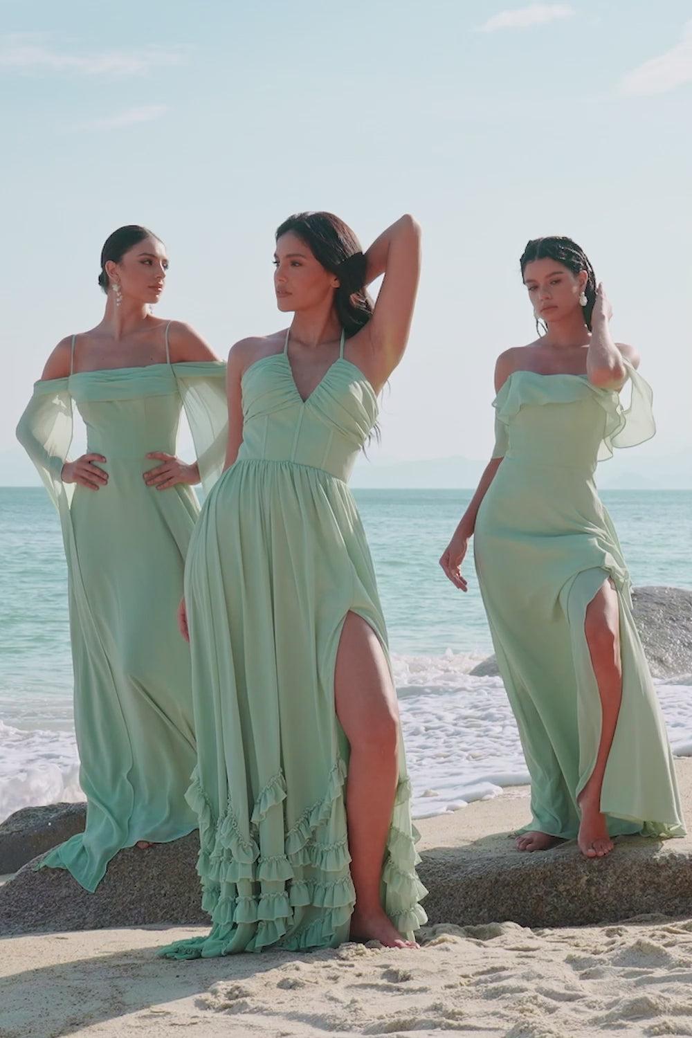 Light Green A-Line Cold Shoulder Chiffon Long Bridesmaid Dress with Capes