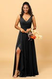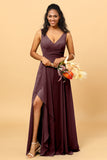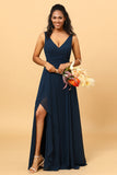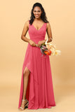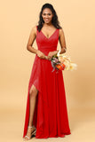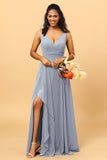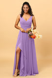 A Line V Neck Floor Length Chiffon Bridesmaid Dress With Slit