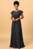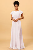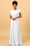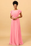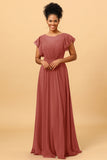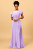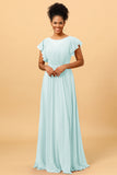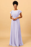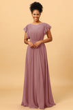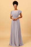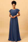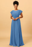 A Line Bateau Neck Ruched Long Chiffon Bridesmaid Dress with Ruffles