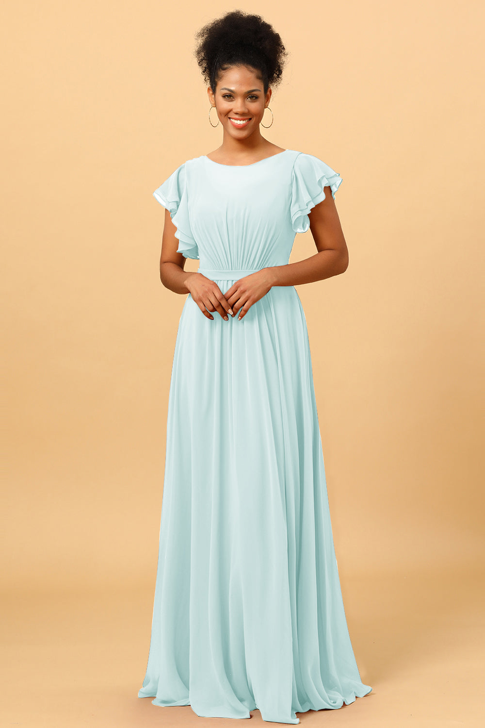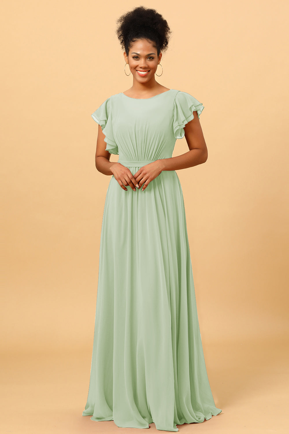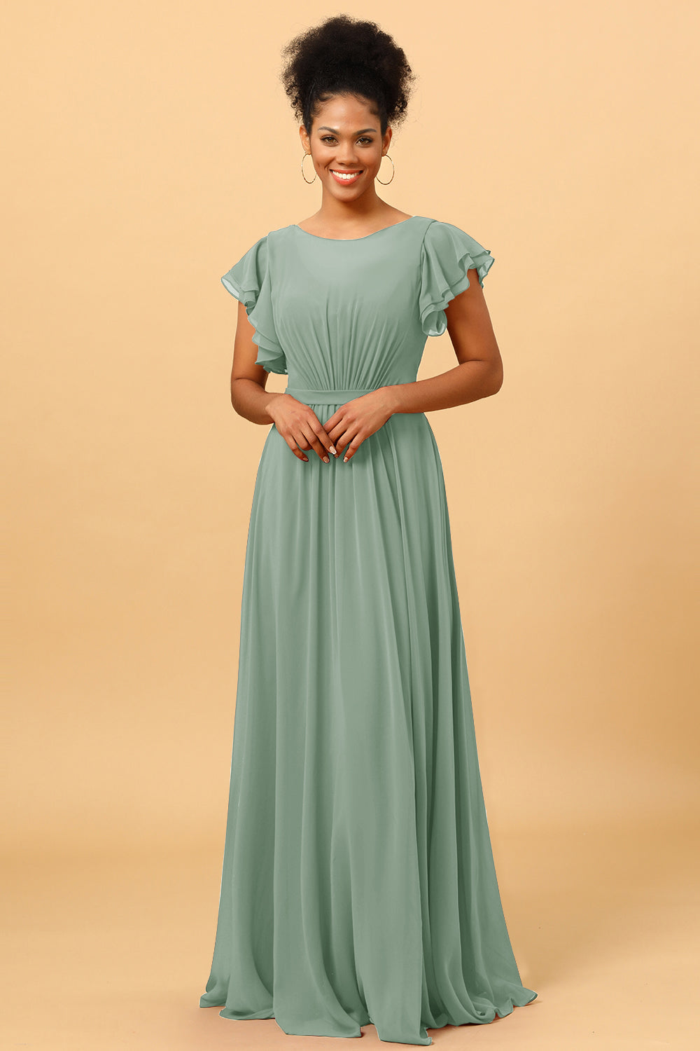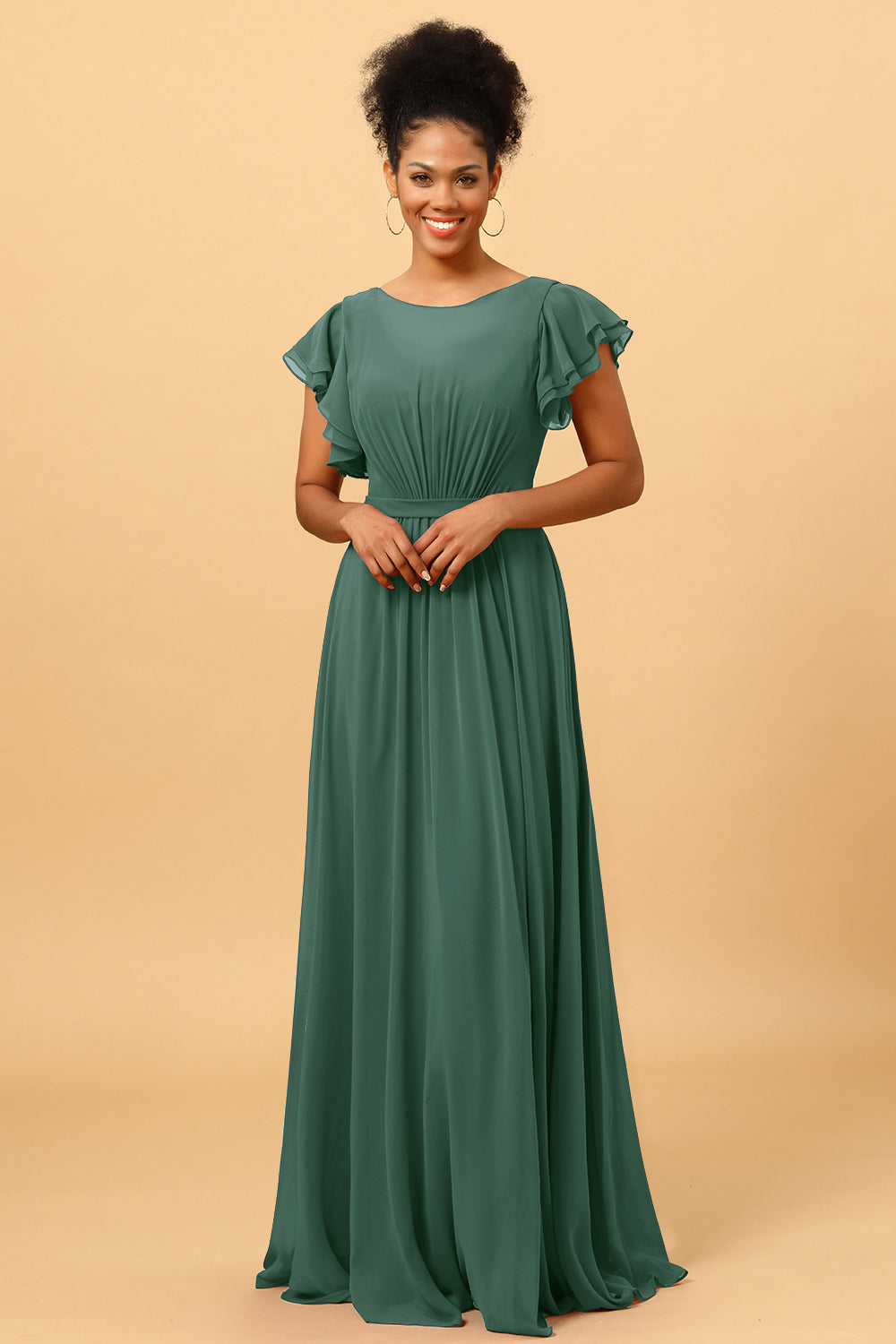 Made of chiffon fabric, this chiffon bateau bridesmaid dress is timeless. Booty ruching creates a flattering silhouette, while ruffled sleeves make a unique look.
