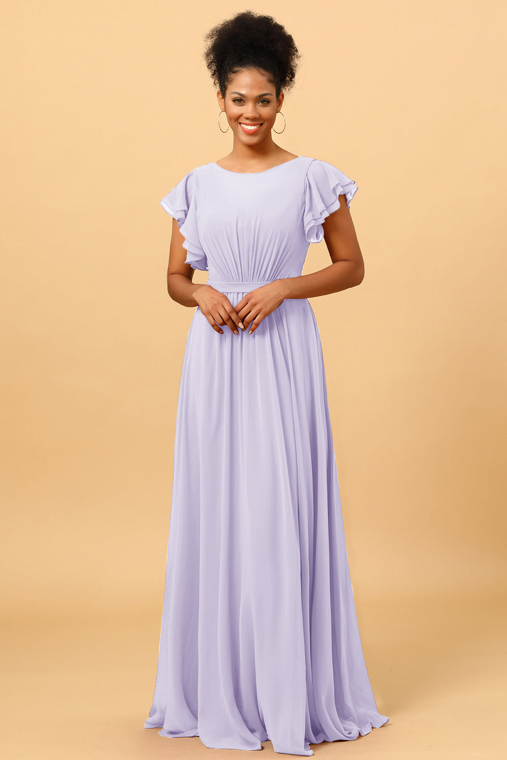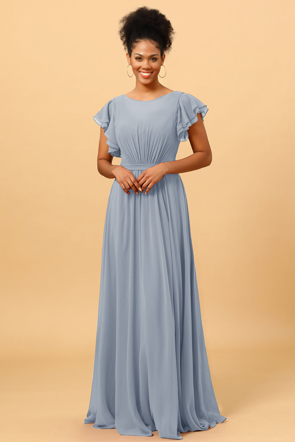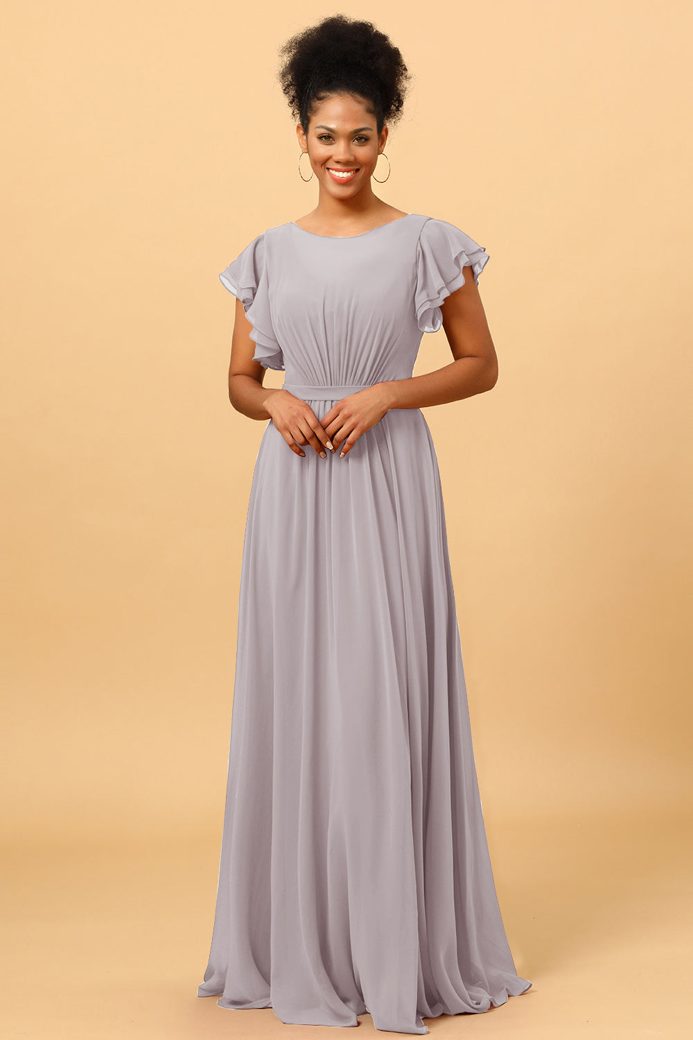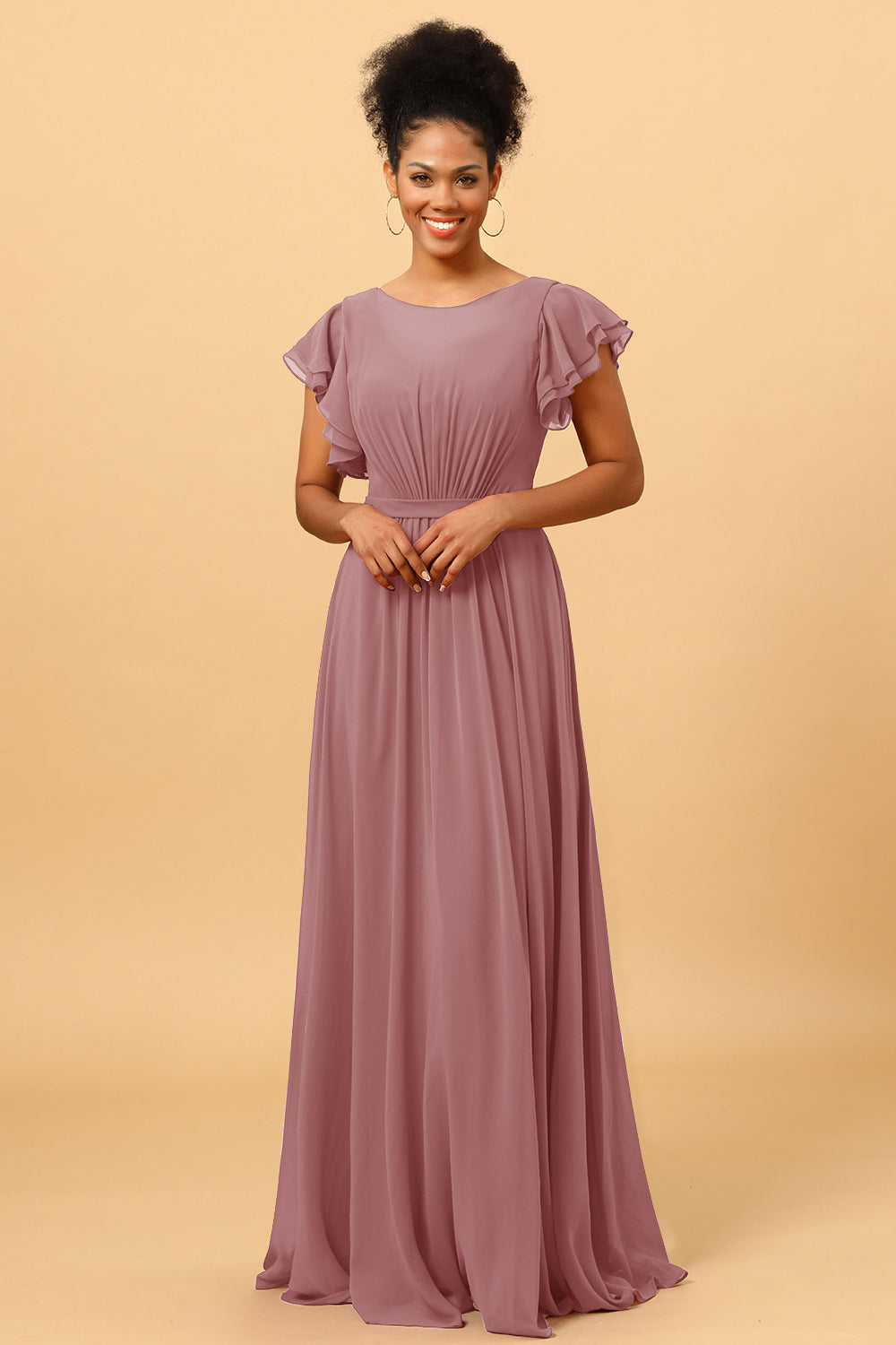 Made of chiffon fabric, this chiffon bateau bridesmaid dress is timeless. Booty ruching creates a flattering silhouette, while ruffled sleeves make a unique look.
