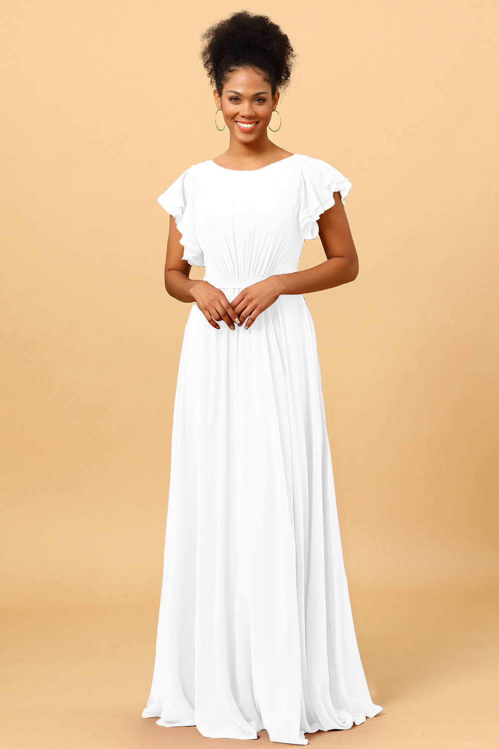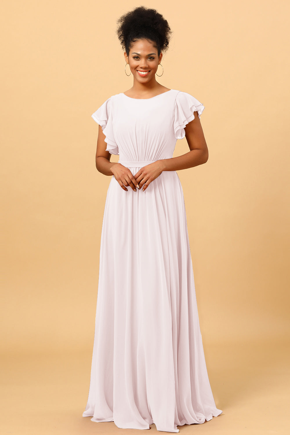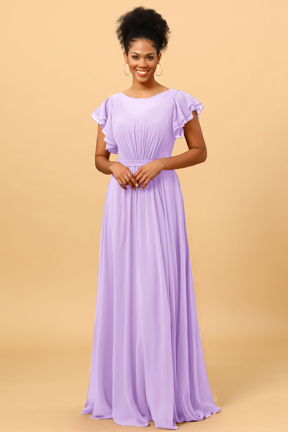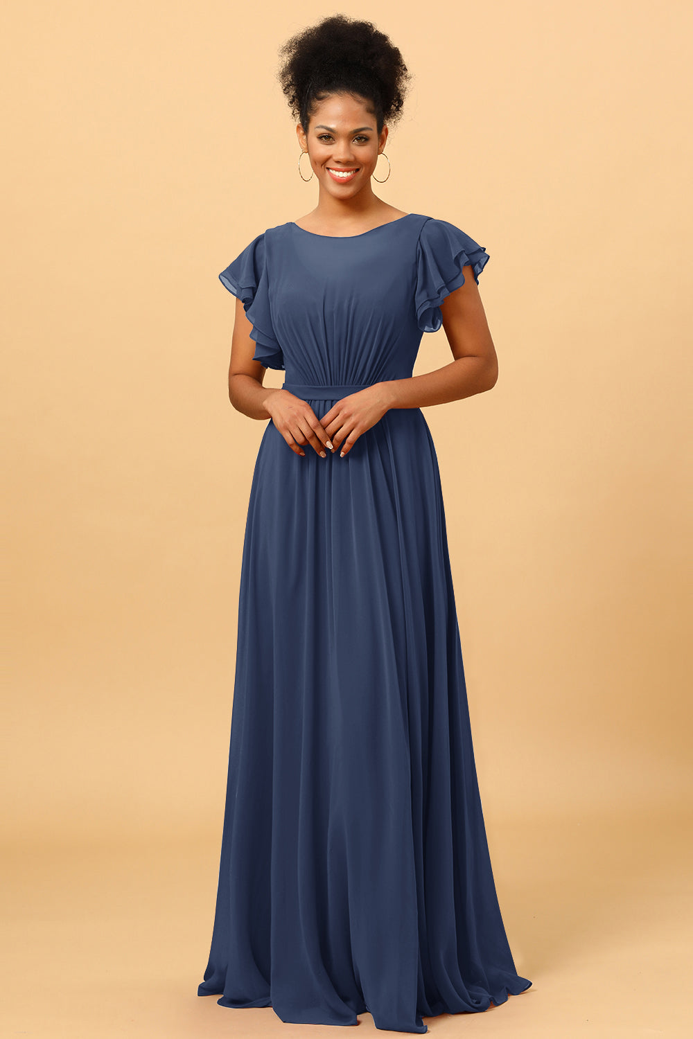 Made of chiffon fabric, this chiffon bateau bridesmaid dress is timeless. Booty ruching creates a flattering silhouette, while ruffled sleeves make a unique look.