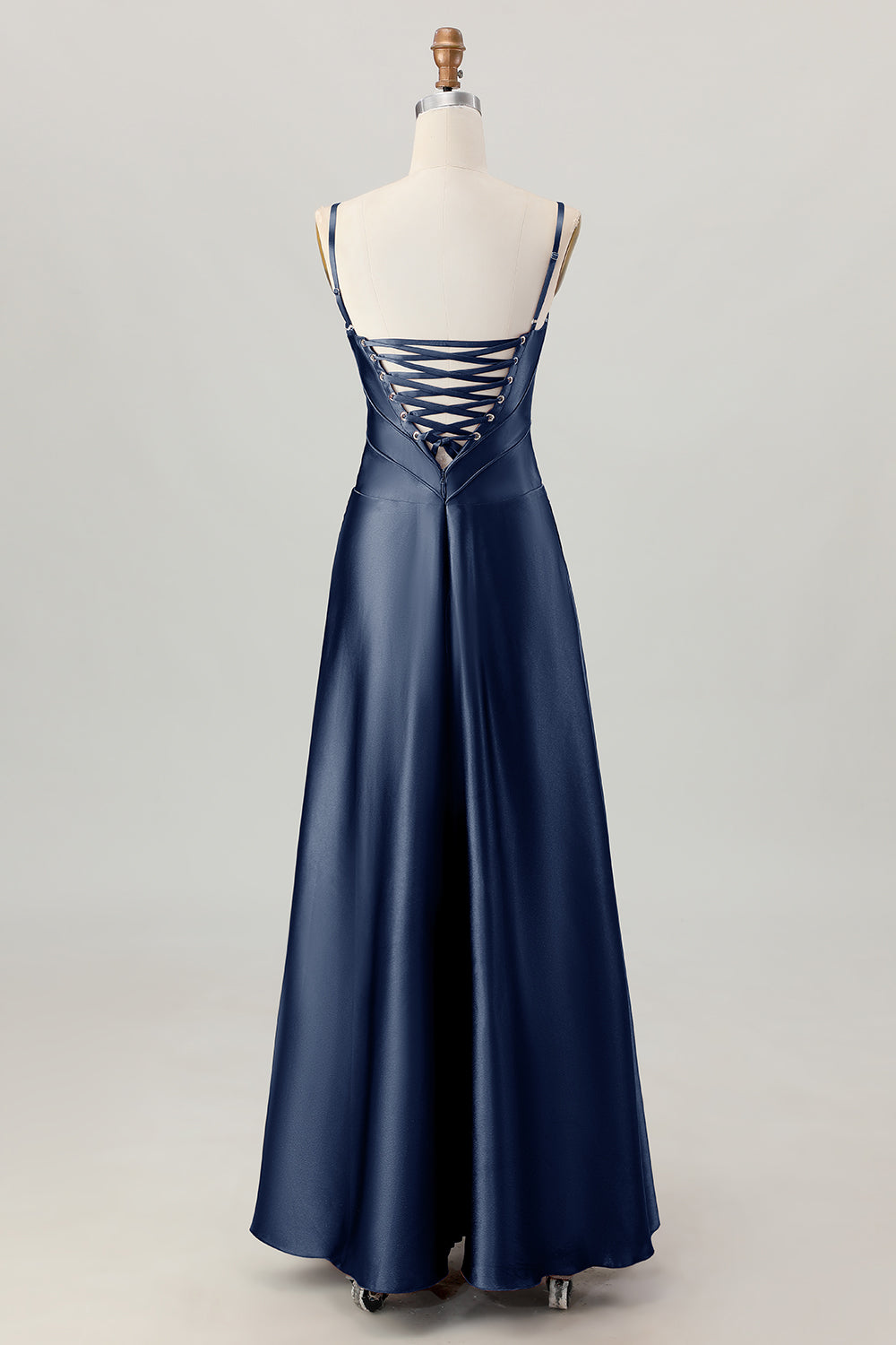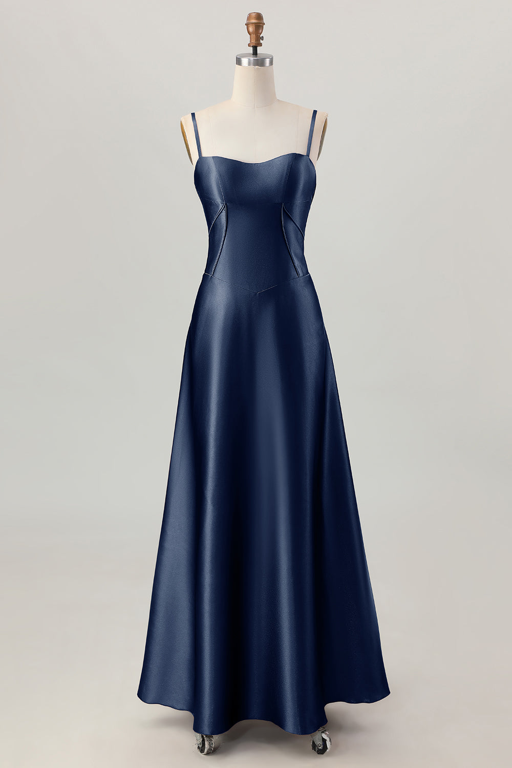 This sleek and sophisticated satin dress is the perfect choice for modern bridesmaids or any elegant evening event. The double spaghetti straps and softly curved neckline create a feminine, flattering frame, while the fitted bodice highlights your shape before flowing into a graceful A-line skirt. Crafted from lustrous satin, the dress catches the light beautifully, adding a subtle glow to every step. Simple yet striking, this dress embodies timeless elegance with a modern twist.